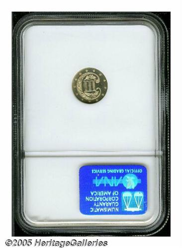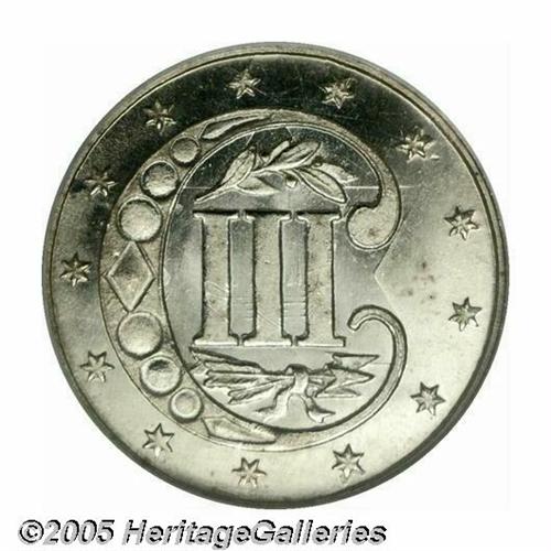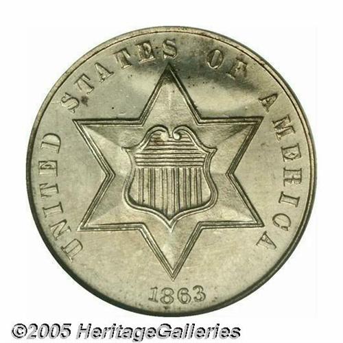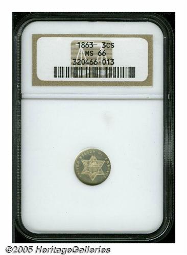 <B>1863<3CS> MS66 NGC.</B></I> Essentially brilliant with gleaming, semi-prooflike surfaces. A mere 21,000 business strikes were produced of this Civil War era issue, with many believed to have been subsequently melted. Population: 12 in 66, 6 finer (4/05).