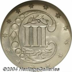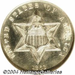<table><tr><td><table><tr><td>1863 3CS MS66 NGC. Fully brilliant with gleaming, satiny surfaces. A mere 21,000 business strikes were produced of this Civil War era issue, with many believed to have been subsequently melted. Population: 15 in 66, 5 finer (3/04). <BR><BR><B>Important notice:</B> Heritage usually auctions material at the rate of 200-250 lots per hour. On some occasions eBay Live bid software or the Internet may not be able to keep up with the pace of the auction. We recommend placing a realistic absentee bid now as insurance to avoid disappointment. Occasionally the auctioneer may eliminate or reject an eBay Live bid, and the auctioneer may also reopen a lot after the close of the eBay live bidding (usually because we missed an audience bid), and may reject your bid even if it shows you as the winning bidder. By bidding via eBay Live, you agree that Heritage may award the lot to another bidder at its sole discretion under the circumstances described above or any other reasonable circumstances. Since eBay bids are not shown to us until we open the lot on the floor, we treat those bids just like floor bids. In most cases the floor responds before the eBay bid is presented to us, due to Internet lag time, so for consistency we have made it a policy that floor bids are always considered first over tie eBay live bids. Also please note that all Heritage lots purchased through eBay Live carry a 20% Buyer's Premium. Please make sure you read the Terms and Conditions before you bid. <BR><BR><B>IMPORTANT ANNOUNCEMENT ABOUT RESERVES:</B> Heritage now divulges all reserves on its web site 7 days before every auction. If you want to know whether the reserve on this lot has been met, and if not, what the reserve amount is, please visit this lot page on the HeritageCoin.com web site, or email: bid@HeritageGalleries.com </span></font></td></tr></table></td></tr></table>