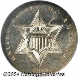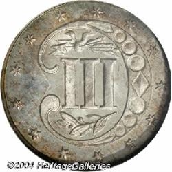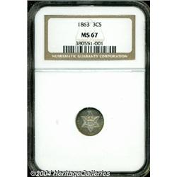 <B>1863<3CS> MS67 NGC.</B></I> A stunning prooflike example of this rare issue from an original mintage of only 21,000 pieces. Although prooflike, there is no doubt about the business strike nature of the coin. The dies are clashed and enough mint frost remains to quell the fears of any doubters. Some gray-golden patina lends an original appearance about the border areas. Population: 4 in 67, 2 finer (9/04). <BR><BR><B>Important notice:</B> Heritage usually auctions material at the rate of 200-250 lots per hour. On some occasions eBay Live bid software or the Internet may not be able to keep up with the pace of the auction. We recommend placing a realistic absentee bid now as insurance to avoid disappointment. Occasionally the auctioneer may eliminate or reject an eBay Live bid, and the auctioneer may also reopen a lot after the close of the eBay live bidding (usually because we missed an audience bid), and may reject your bid even if it shows you as the winning bidder. By bidding via eBay Live, you agree that Heritage may award the lot to another bidder at its sole discretion under the circumstances described above or any other reasonable circumstances. Since eBay bids are not shown to us until we open the lot on the floor, we treat those bids just like floor bids. In most cases the floor responds before the eBay bid is presented to us, due to Internet lag time, so for consistency we have made it a policy that floor bids are always considered first over tie eBay live bids. Also please note that all Heritage lots purchased through eBay Live carry a 20% Buyer's Premium. Please make sure you read the Terms and Conditions before you bid.
