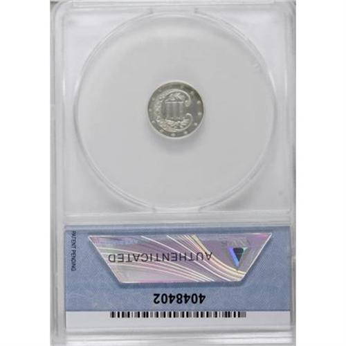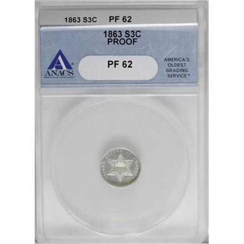 <B>1863 3CS PR62 ANACS.</B></I> Sharply struck with delicate silver-gray haze over the lightly hairlined surfaces. Both sides exhibit excellent detail, and the obverse offers a modicum of contrast. One of just 460 specimens struck.<BR><I>From The John Stimson, Sr. Collection, Part One.</B></I><BR><BR><B>Coin Engraver:</B> James B. Longacre<BR><BR><b>Shipping:</b> Coins & Currency (<a target="_blank" href="http://www.heritageauctions.com/common/shipping.php">view shipping information</a>)