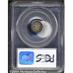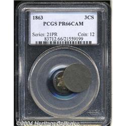 <B>1863<3CS> PR66 Cameo PCGS.</B></I> Beautiful, colorful target toning graces both sides of this lovely trime that is well struck and seemingly free of significant abrasions. Some faint roller marks (as struck) are noted on the reverse. Population: 1 in 66, 0 finer (3/04). <BR><BR><B>Important notice:</B> Heritage usually auctions material at the rate of 200-250 lots per hour. On some occasions eBay Live bid software or the Internet may not be able to keep up with the pace of the auction. We recommend placing a realistic absentee bid now as insurance to avoid disappointment. Occasionally the auctioneer may eliminate or reject an eBay Live bid, and the auctioneer may also reopen a lot after the close of the eBay live bidding (usually because we missed an audience bid), and may reject your bid even if it shows you as the winning bidder. By bidding via eBay Live, you agree that Heritage may award the lot to another bidder at its sole discretion under the circumstances described above or any other reasonable circumstances. Since eBay bids are not shown to us until we open the lot on the floor, we treat those bids just like floor bids. In most cases the floor responds before the eBay bid is presented to us, due to Internet lag time, so for consistency we have made it a policy that floor bids are always considered first over tie eBay live bids. Also please note that all Heritage lots purchased through eBay Live carry a 20% Buyer's Premium. Please make sure you read the Terms and Conditions before you bid.
