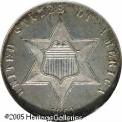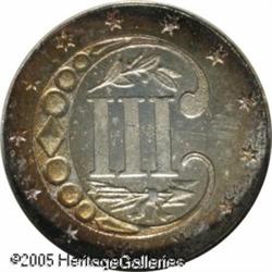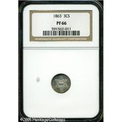 <B>1863 3CS PR66 NGC.</B></I> An intricately detailed specimen, one of just 460 pieces struck, with striated fields on the obverse and more of a deep, glassy appearance on the reverse. The peerless surfaces are rather lightly toned except for an arc of rich russet color on the reverse. Population: 14 in 66, 6 finer (1/05). Lot:5677