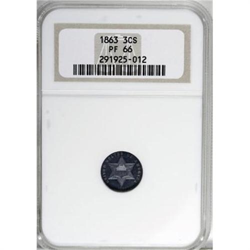 <B>1863 3CS PR66 NGC.</B></I> Vibrant sapphire patina dominates the obverse and appears on the obverse of this gleaming Premium Gem. A delightful specimen from this Civil War-era trime issue. Census: 15 in 66, 6 finer (11/07).<BR><BR><B>Coin Engraver:</B> James B. Longacre<BR><BR><b>Shipping:</b> Coins & Currency (<a target="_blank" href="http://www.heritageauctions.com/common/shipping.php">view shipping information</a>)