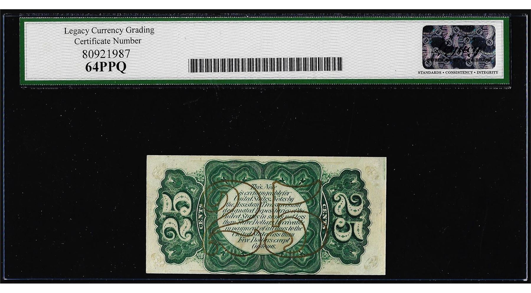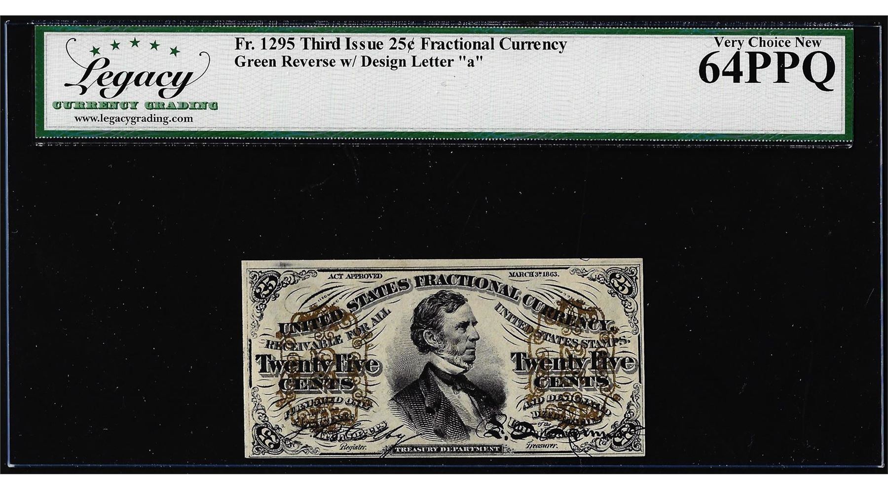 One 1863 3rd Issue 25 Cents Fractional Currency Note Fr.1295 Legacy Very Choice New 64PPQ. Legacy Graded.