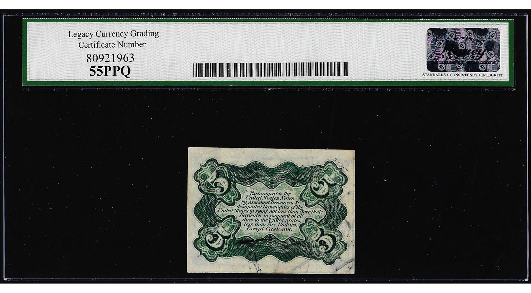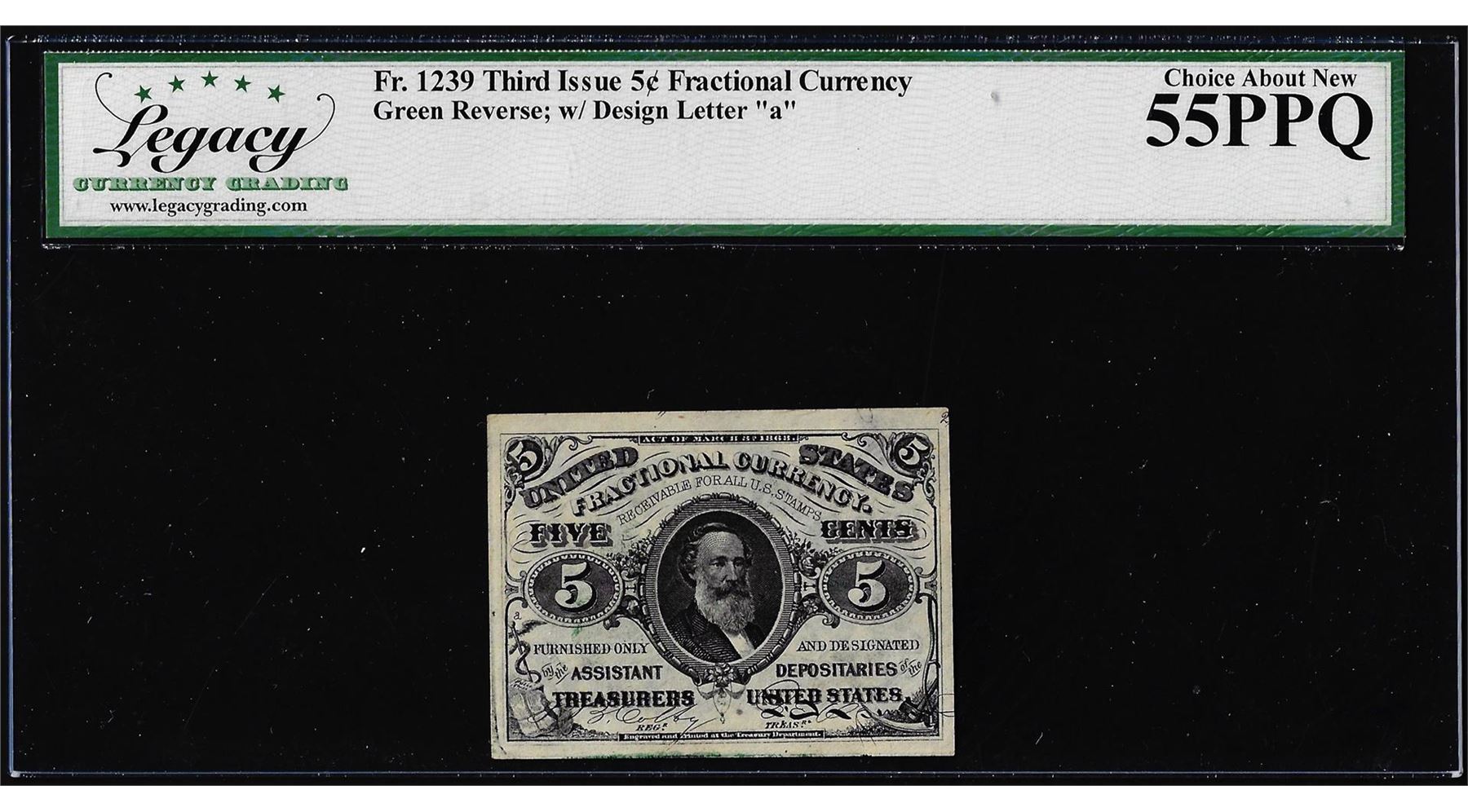 One 1863 3rd Issue 5 Cents Fractional Currency Note Fr.1239 Legacy Choice About New 55PPQ. Legacy Graded.