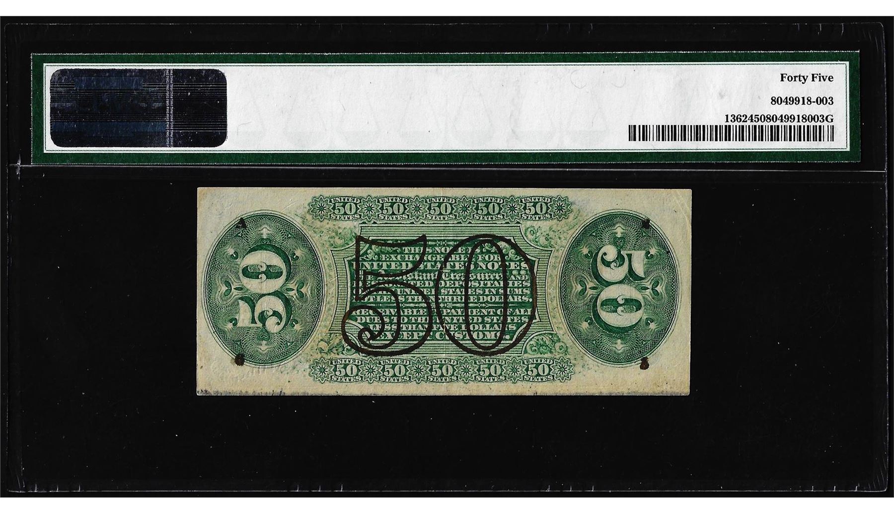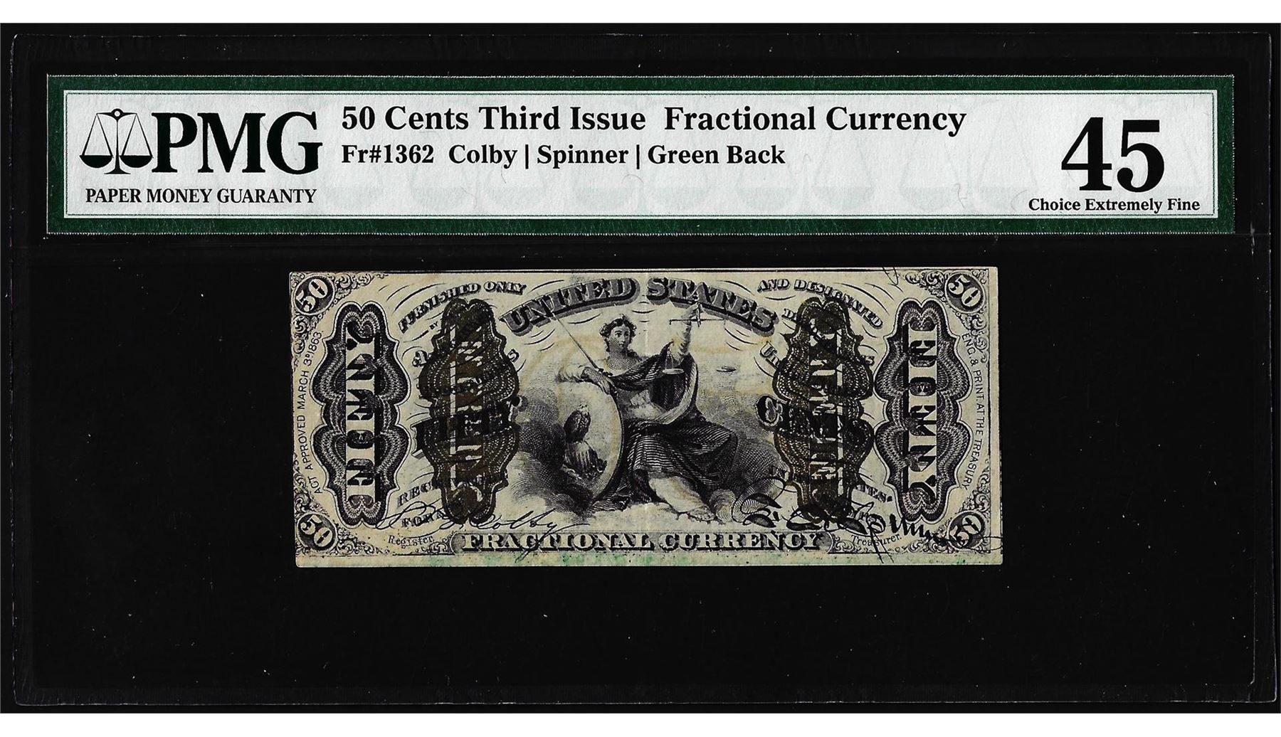 One 1863 3rd Issue 50 Cents Spinner Fractional Currency Note PMG Choice Extremely Fine 45. PMG Certified.