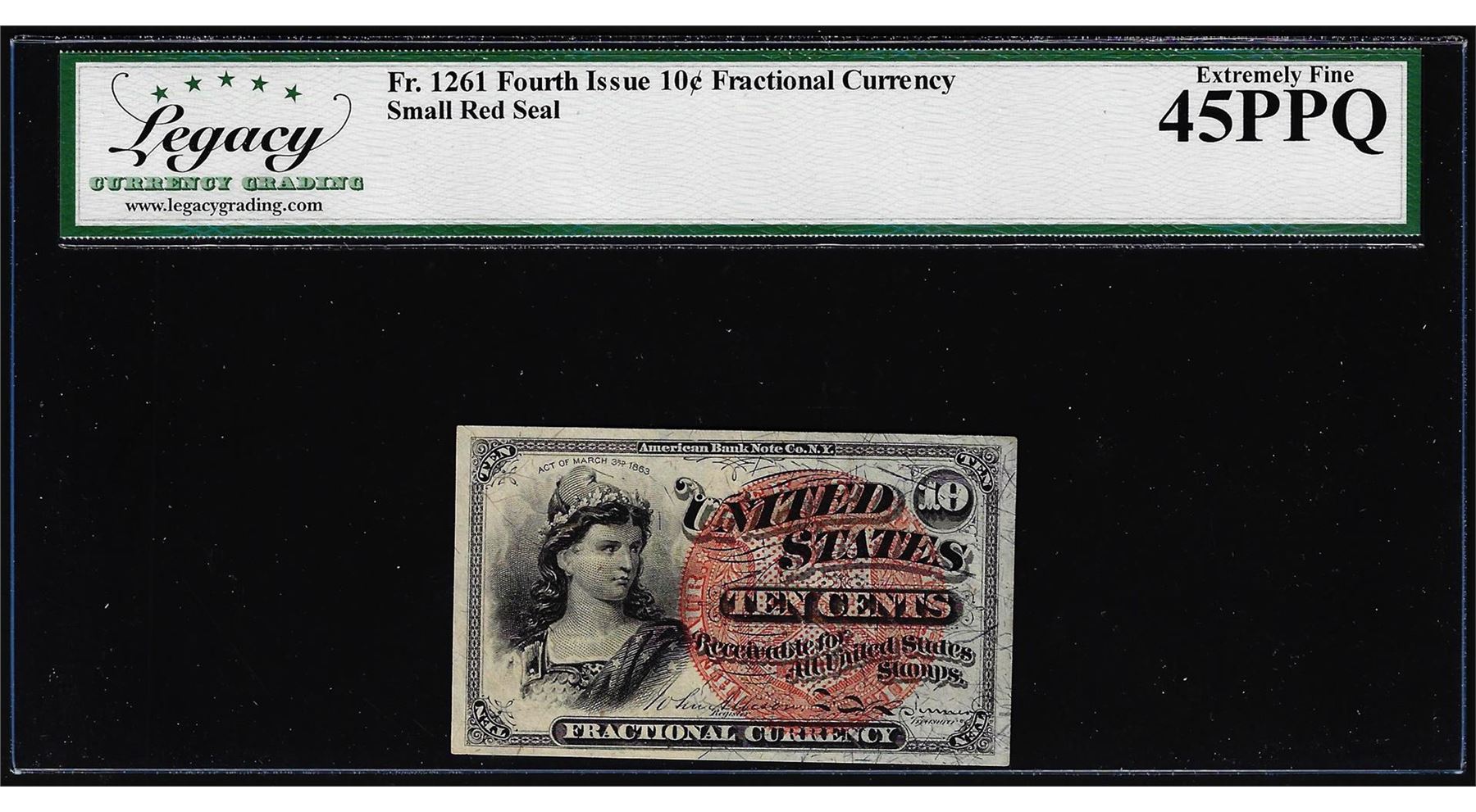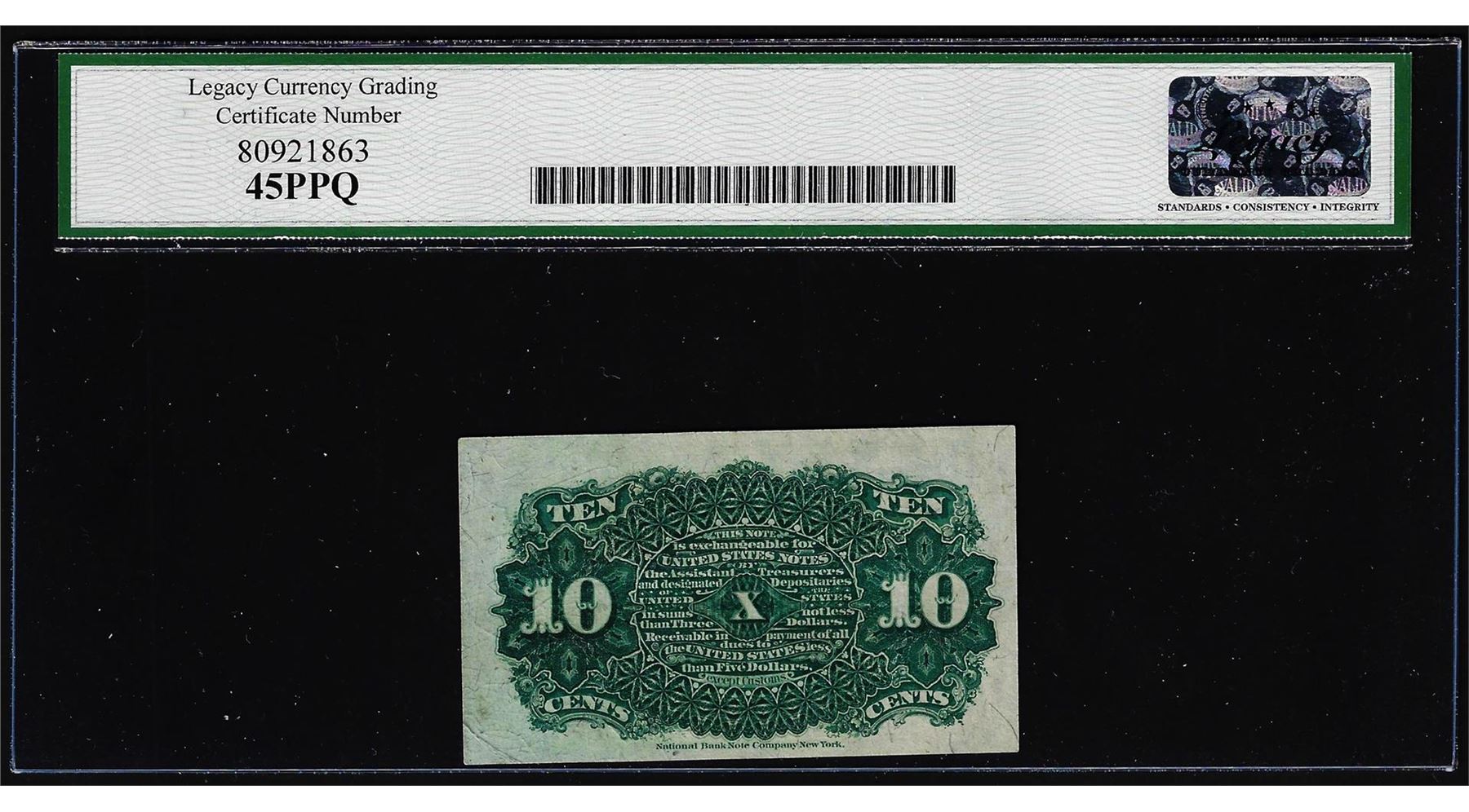 One 1863 4th Issue 10 Cents Fractional Currency Note Fr.1261 Legacy Extremely Fine 45PPQ. Legacy Graded.