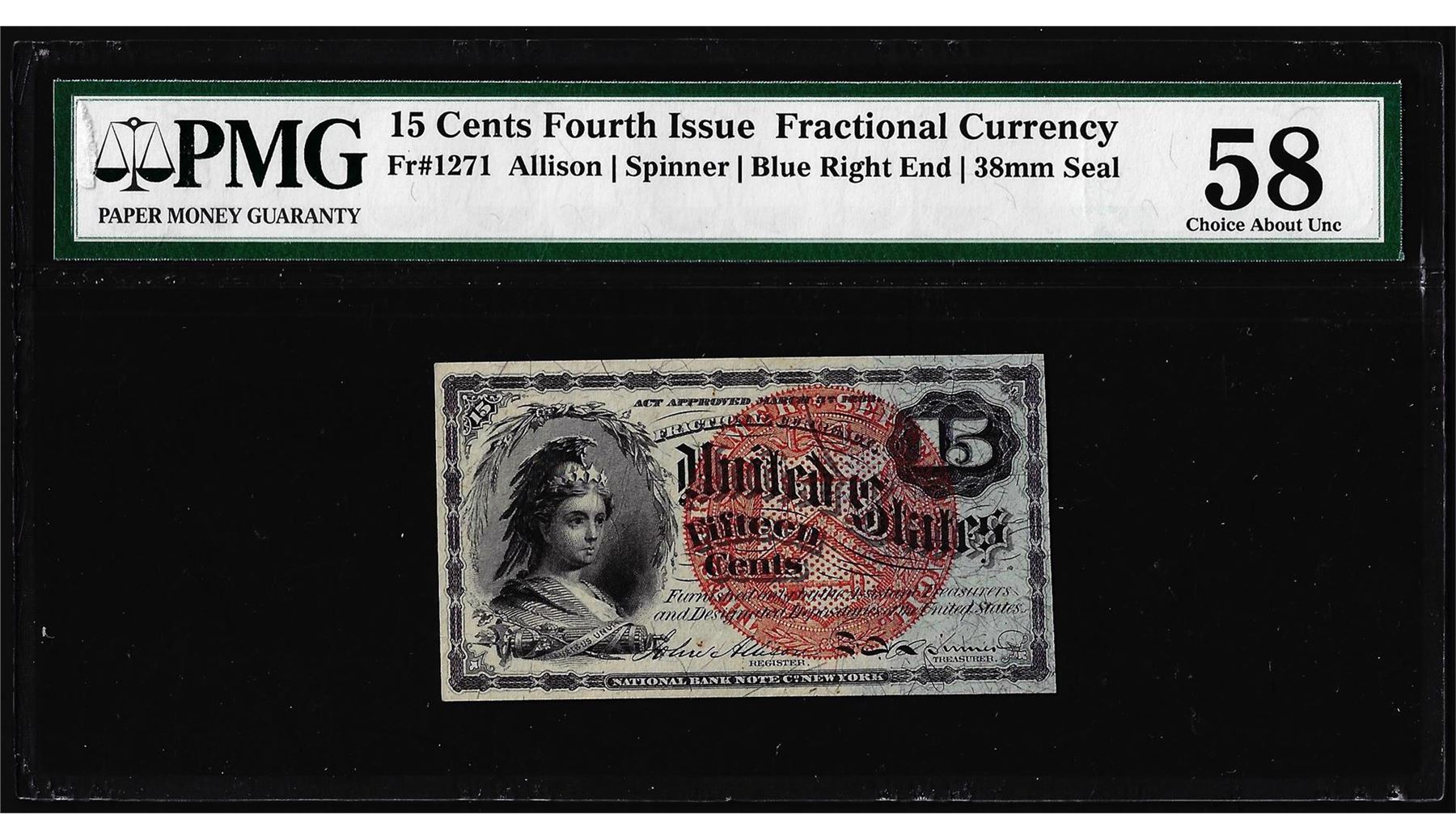 One 1863 4th Issue 15 Cents Fractional Currency Note Fr.1271 PMG Ch. About Uncirculated 58. PMG Certified.