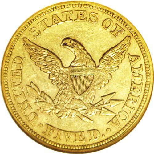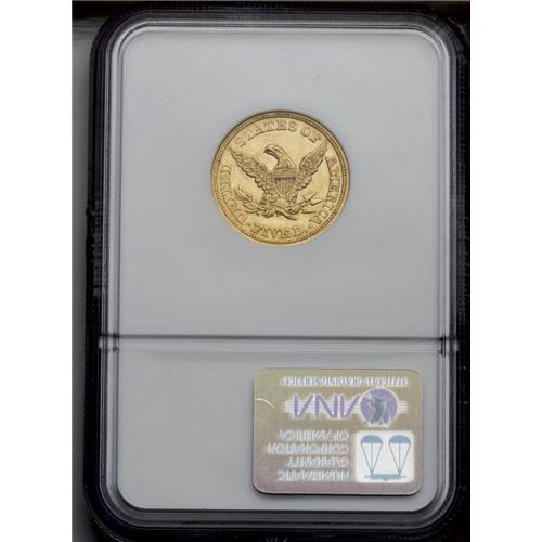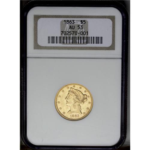 <B>1863<$5> AU53 NGC.</B></I> The 1863 is an exceptionally rare half eagle in the No Motto series. Only 2,442 business strikes were produced, and, as one might imagine, very few exist today in any grade. When encountered, VF-XF is the usual grade range for this issue with only 23 pieces known in AU, and a mere two coins graded in Mint State, by NGC (none have been so designated by PCGS). This is a well struck coin that retains a fair amount of reflective luster over the basic reddish-gold surfaces. The fields and devices are peppered with innumerable small marks on each side, none worthy of singular mention. Of the greatest importance to collectors of rare date gold. Census: 2 in 53, 9 finer (8/06).<BR><I>From The Clifton Rodenburg Collection.</B></I>