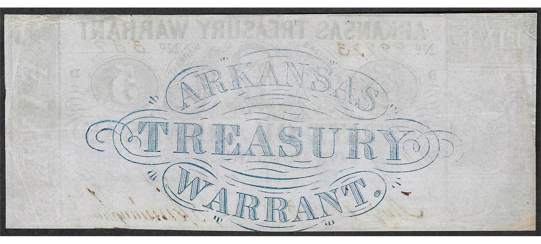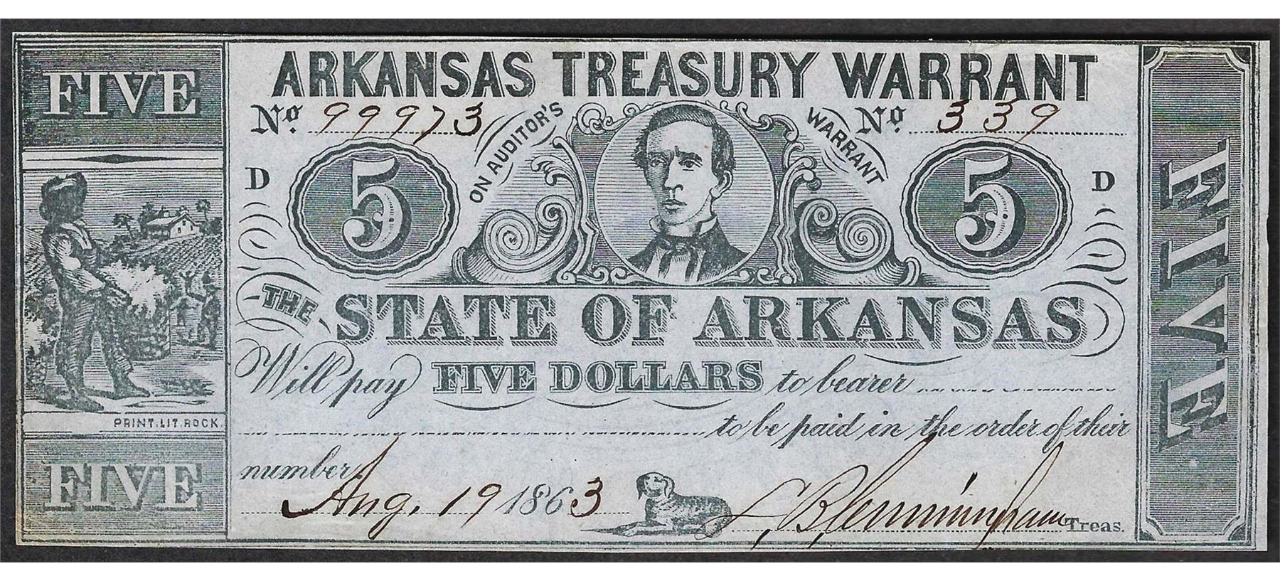 One 1863 $5 Arkansas Treasury Warrant Obsolete Note.