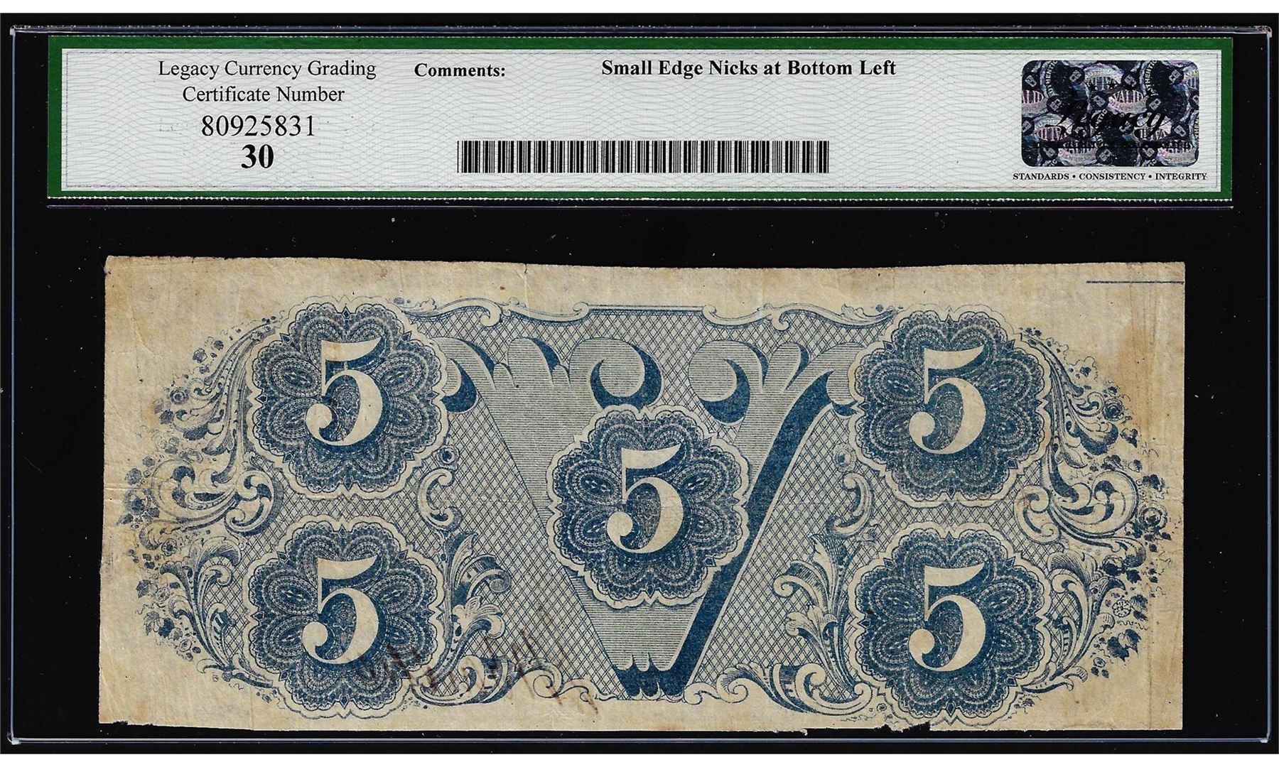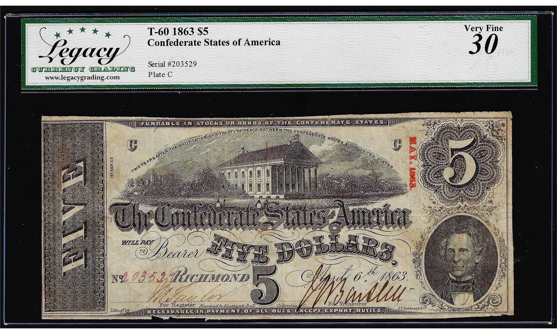 One 1863 $5 Confederate State of America Note T-60 Legacy Very Fine 30. Legacy Graded.