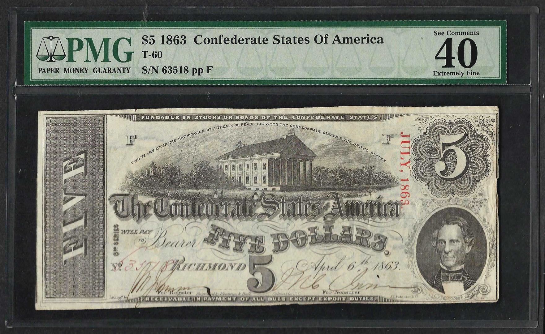 One 1863 $5 Confederate State of America Note T-60 PMG Extremely Fine 40. PMG Certified.