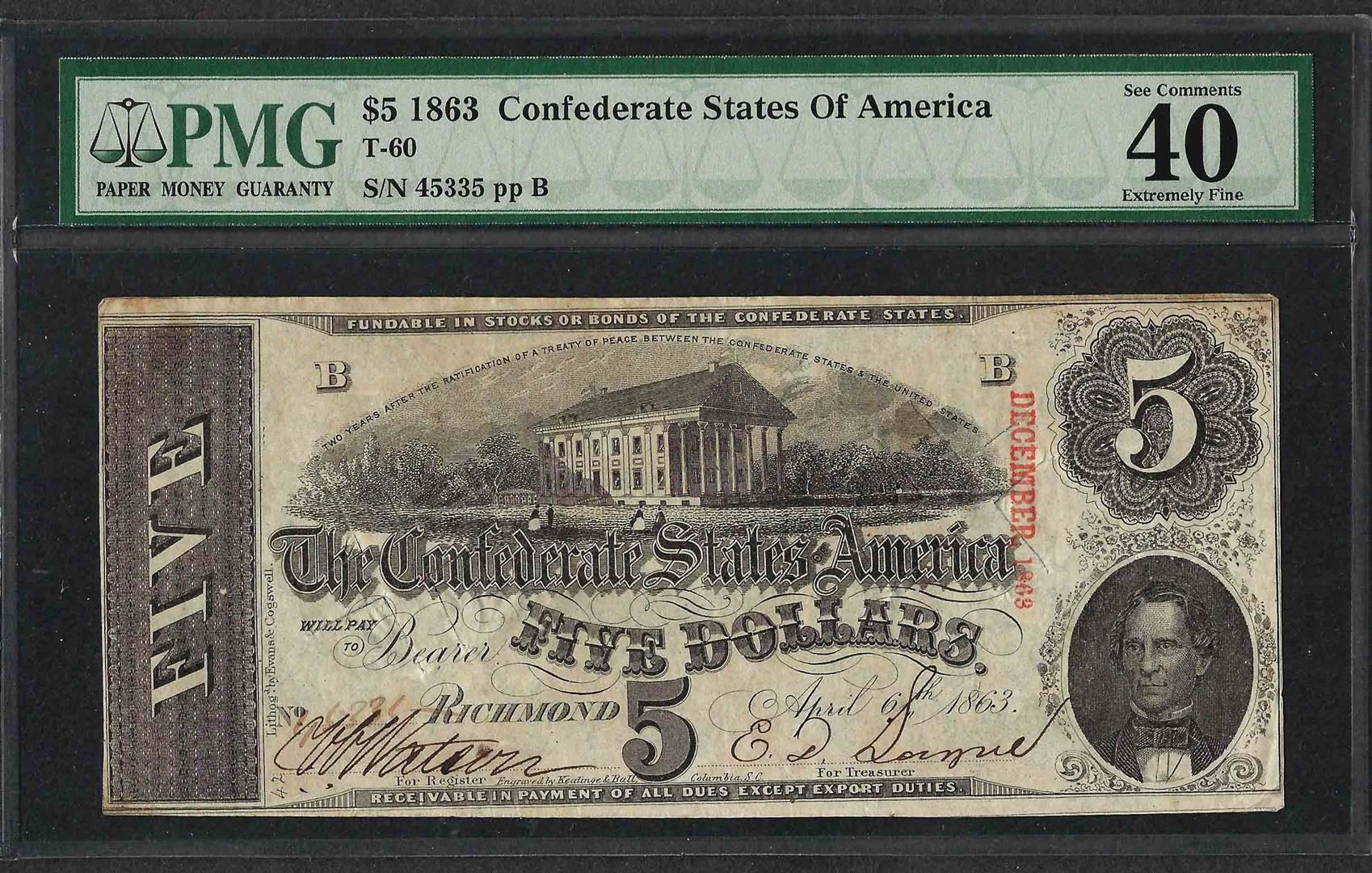 One 1863 $5 Confederate State of America Note T-60 PMG Extremely Fine 40. PMG Certified.