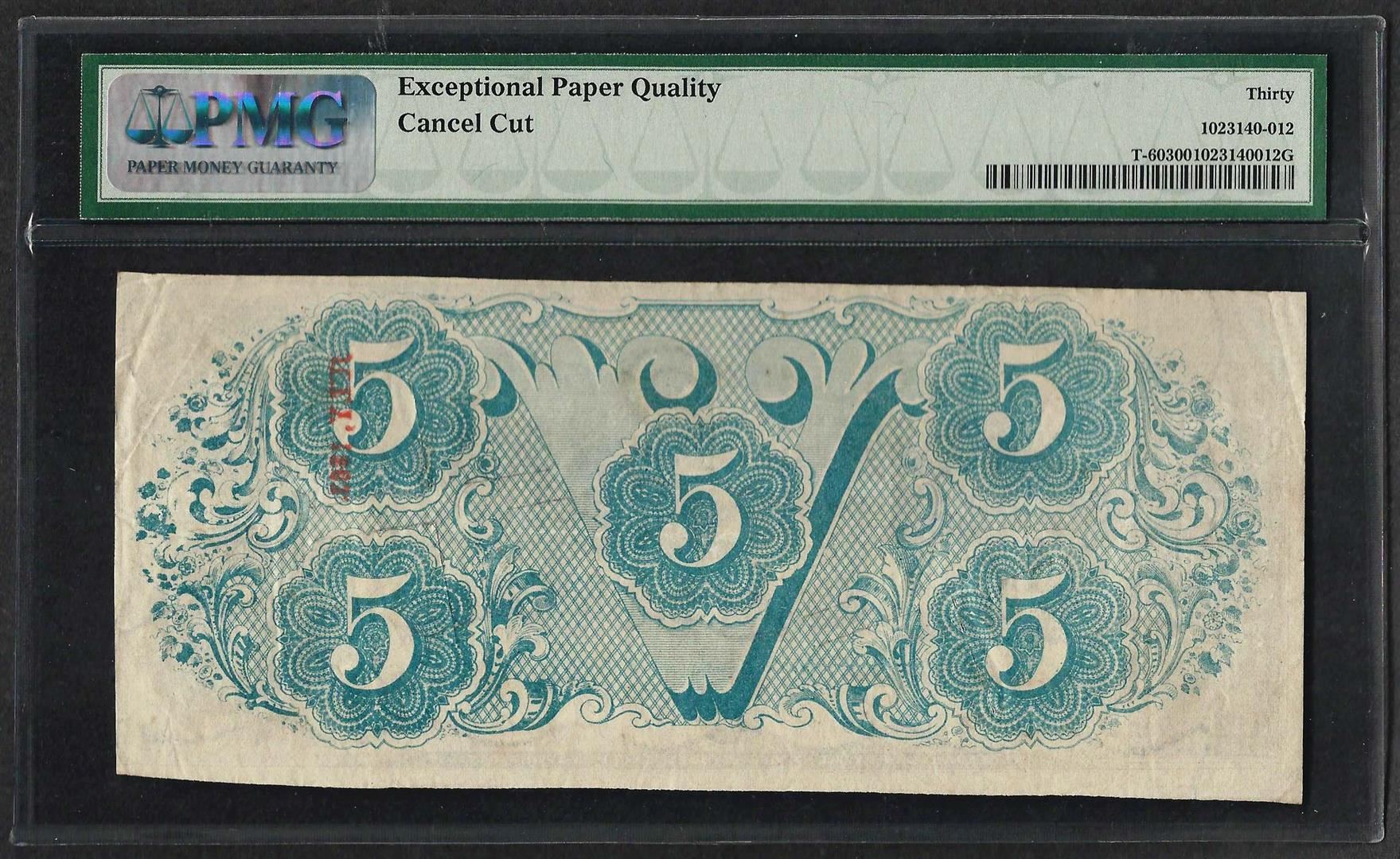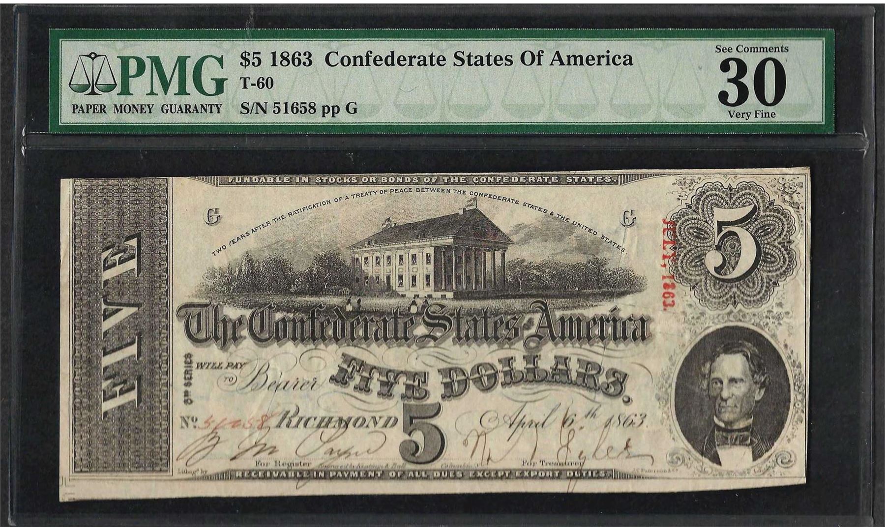 1863 $5 Confederate State of America Note T-60 PMG Very Fine 30