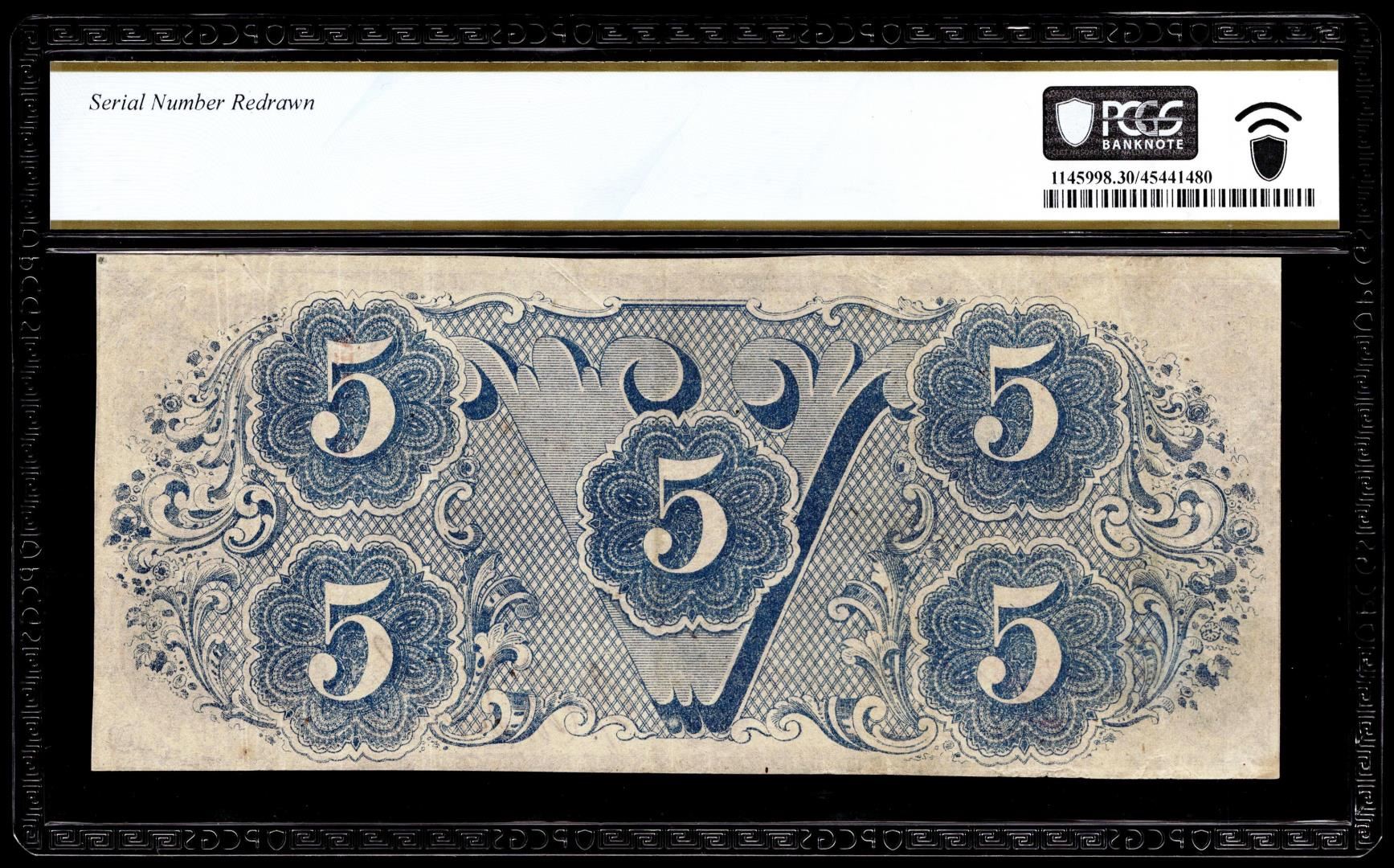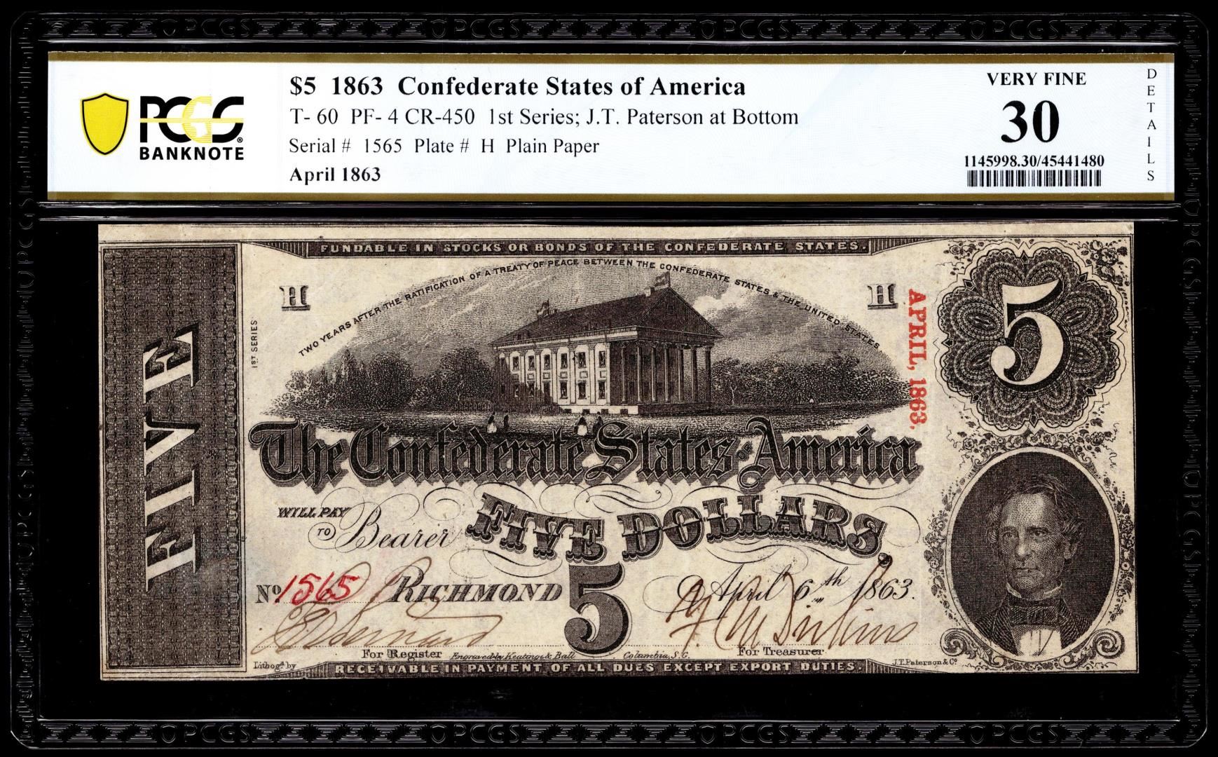 1863 $5 Confederate States of America Note T-60 PF-4 CR-450 PCGS Very Fine 30 Details