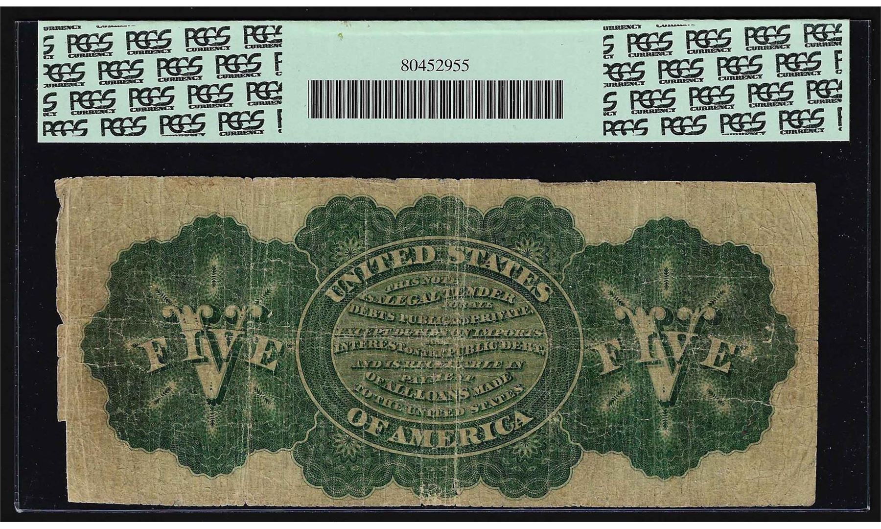 One 1863 $5 Legal Tender Note Fr.63 PCGS Fine 12 Apparent. PCGS Graded.