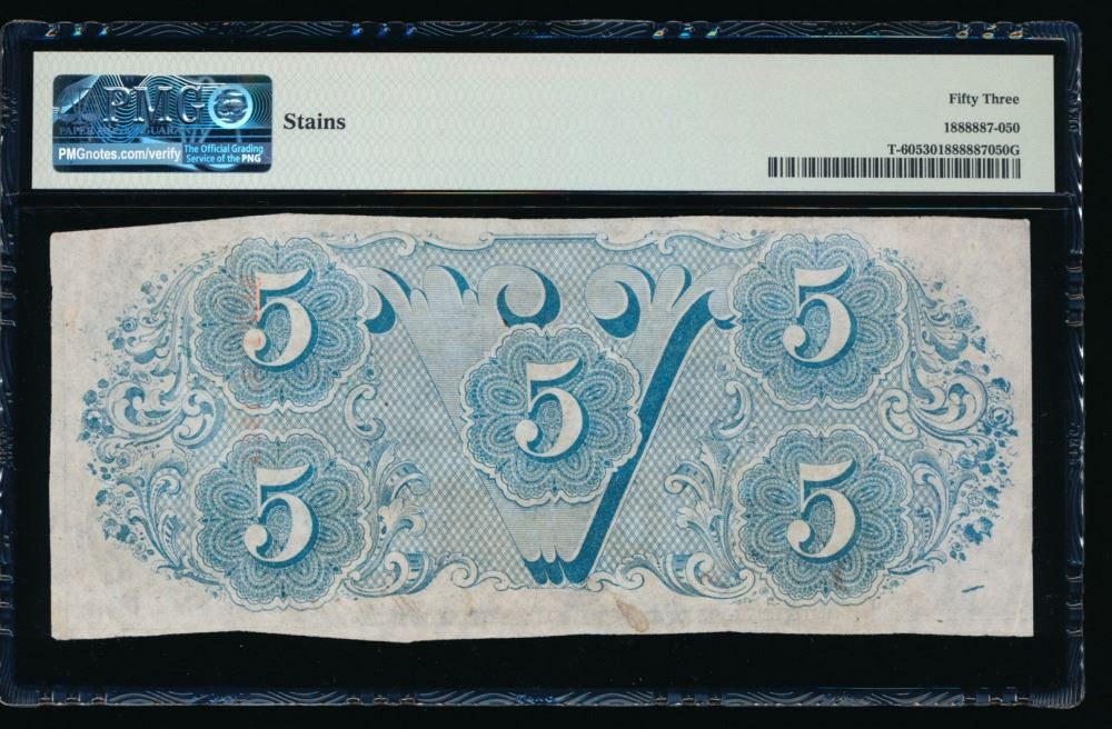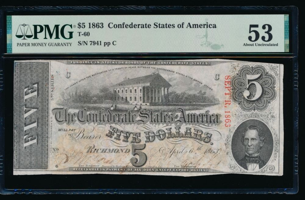 One 1863 $5 T-60 Confederate PMG 53.