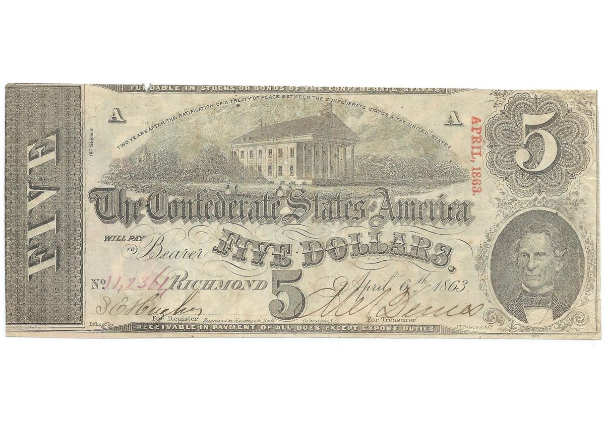 One 1863 $5 The Confederate States of America Note T-60 CC