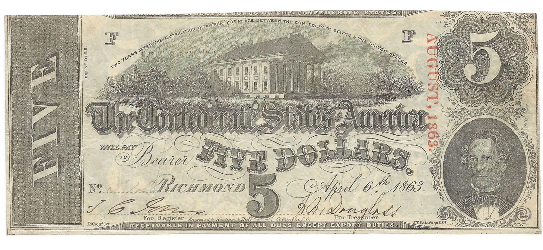 One 1863 $5 The Confederate States of America Note T-60 CC