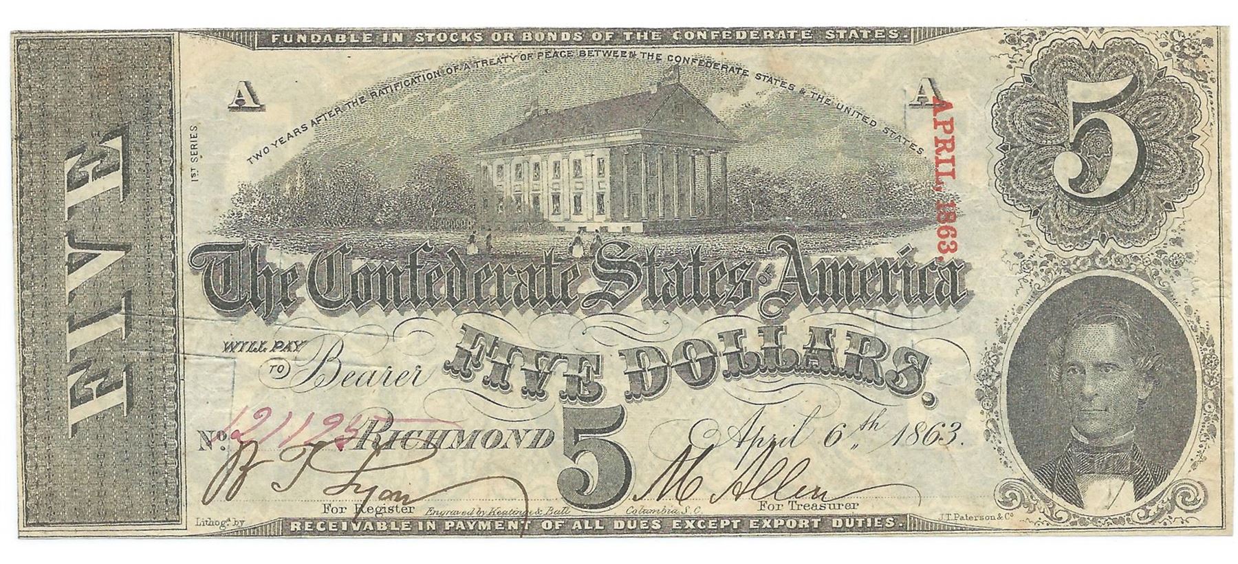 One 1863 $5 The Confederate States of America Note T-60 CC