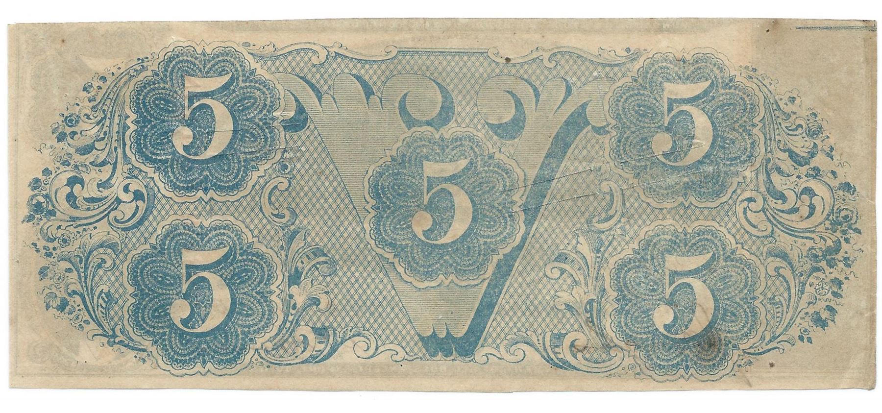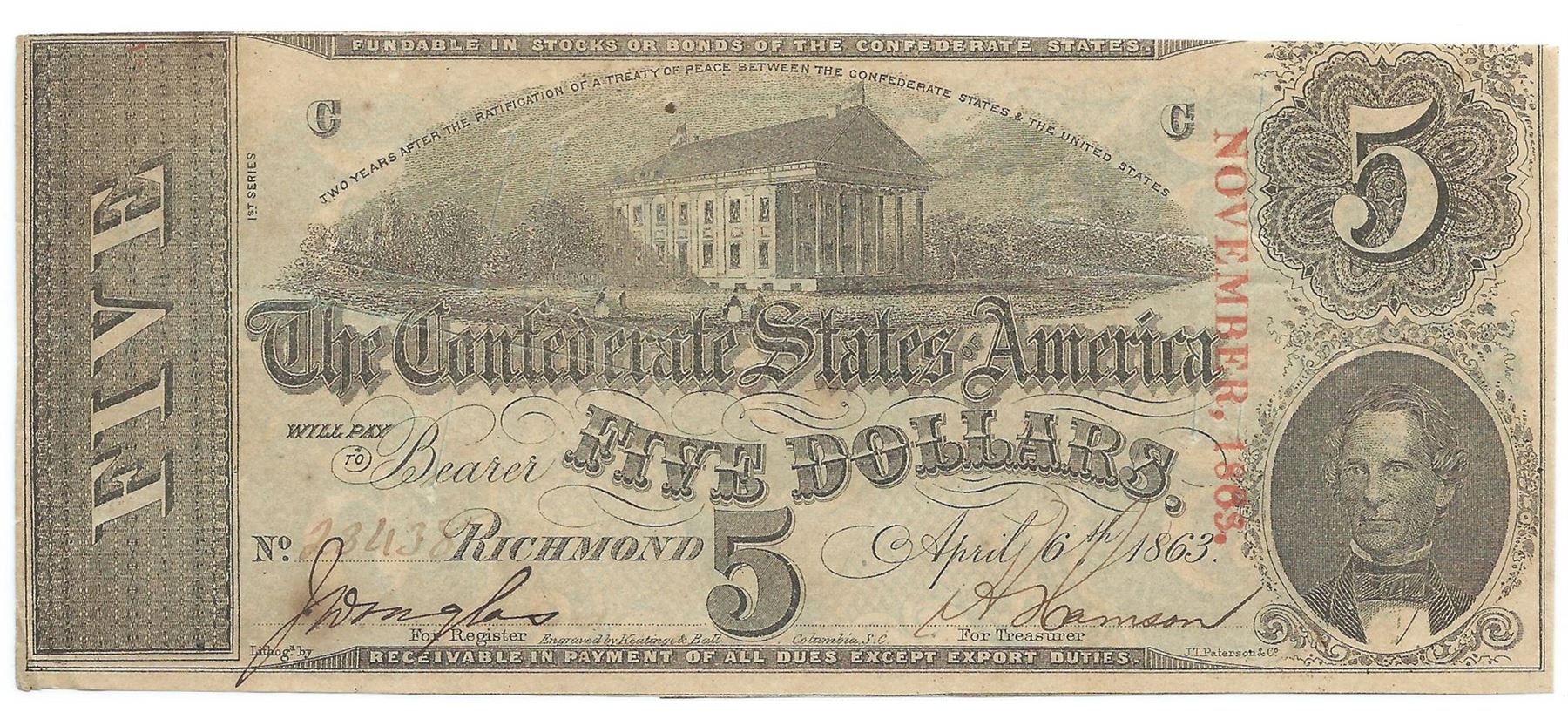 One 1863 $5 The Confederate States of America Note T-60 CC