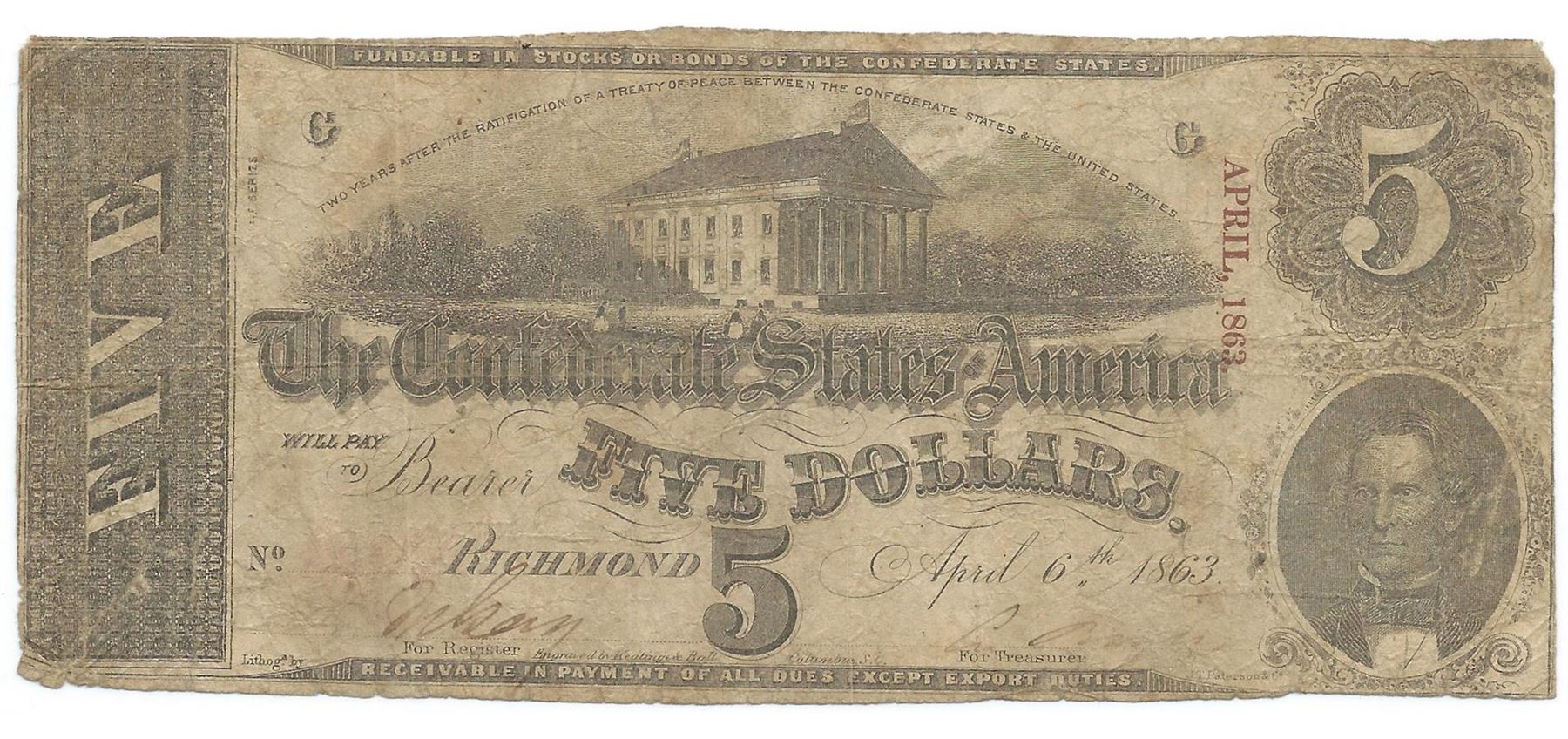 One 1863 $5 The Confederate States of America Note T-60 CC