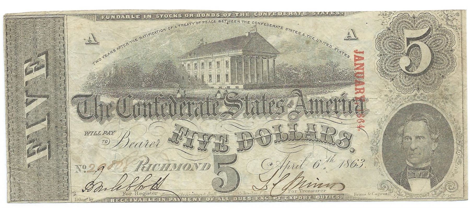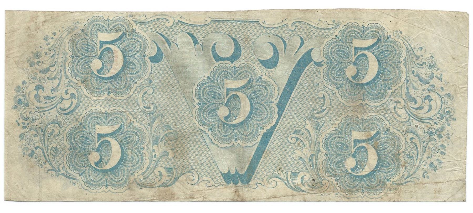 One 1863 $5 The Confederate States of America Note T-60 CC