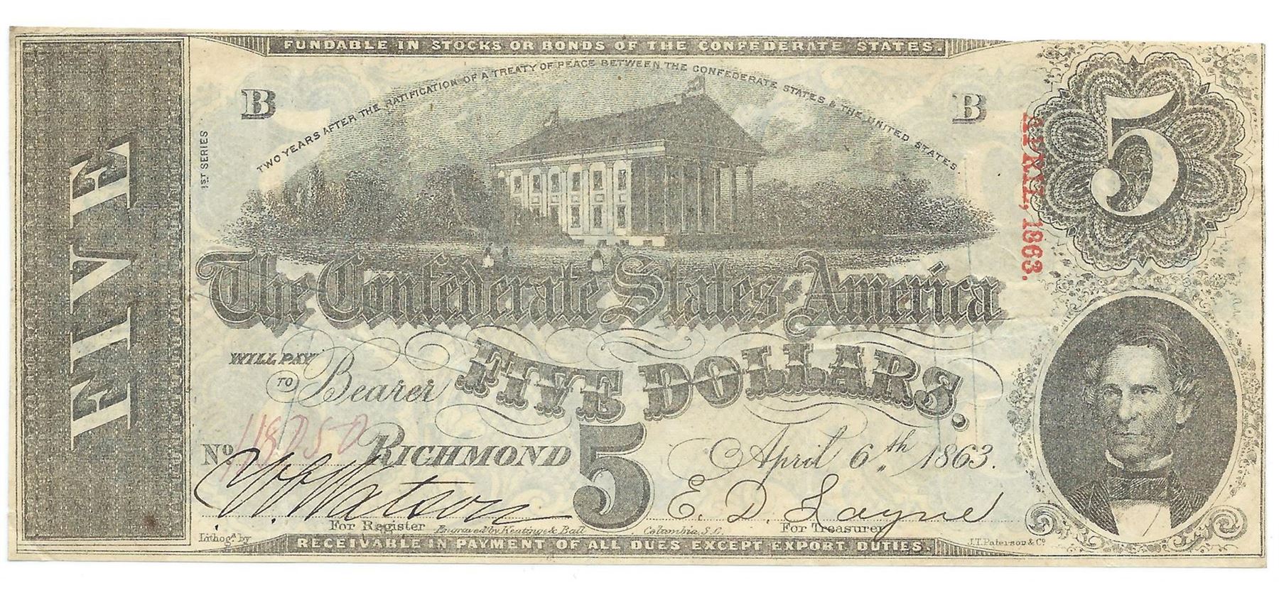 One 1863 $5 The Confederate States of America Note T-60 CC