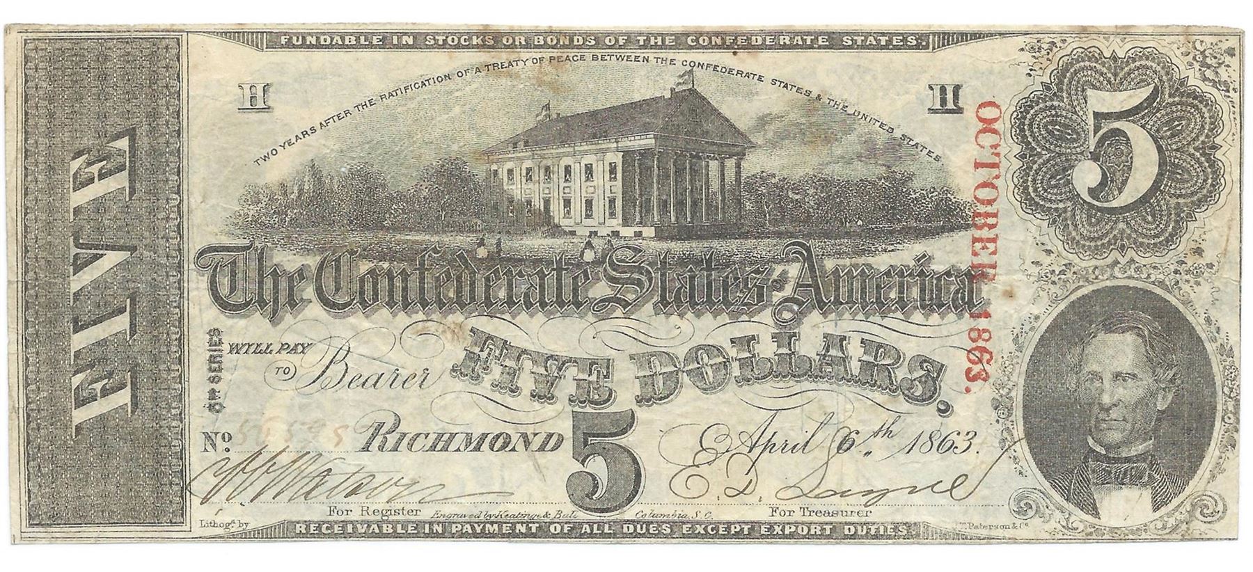 One 1863 $5 The Confederate States of America Note T-60 CC