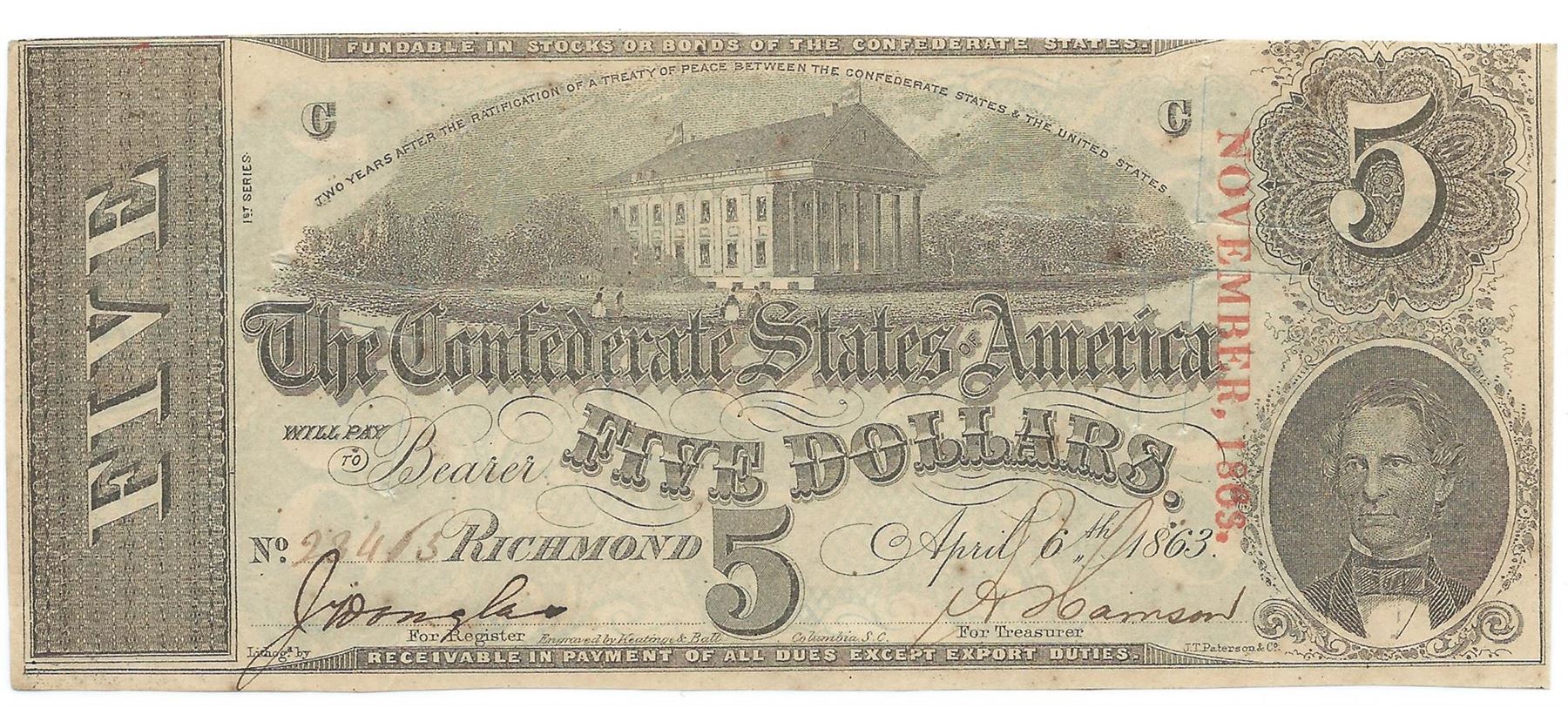 One 1863 $5 The Confederate States of America Note T-60 CC