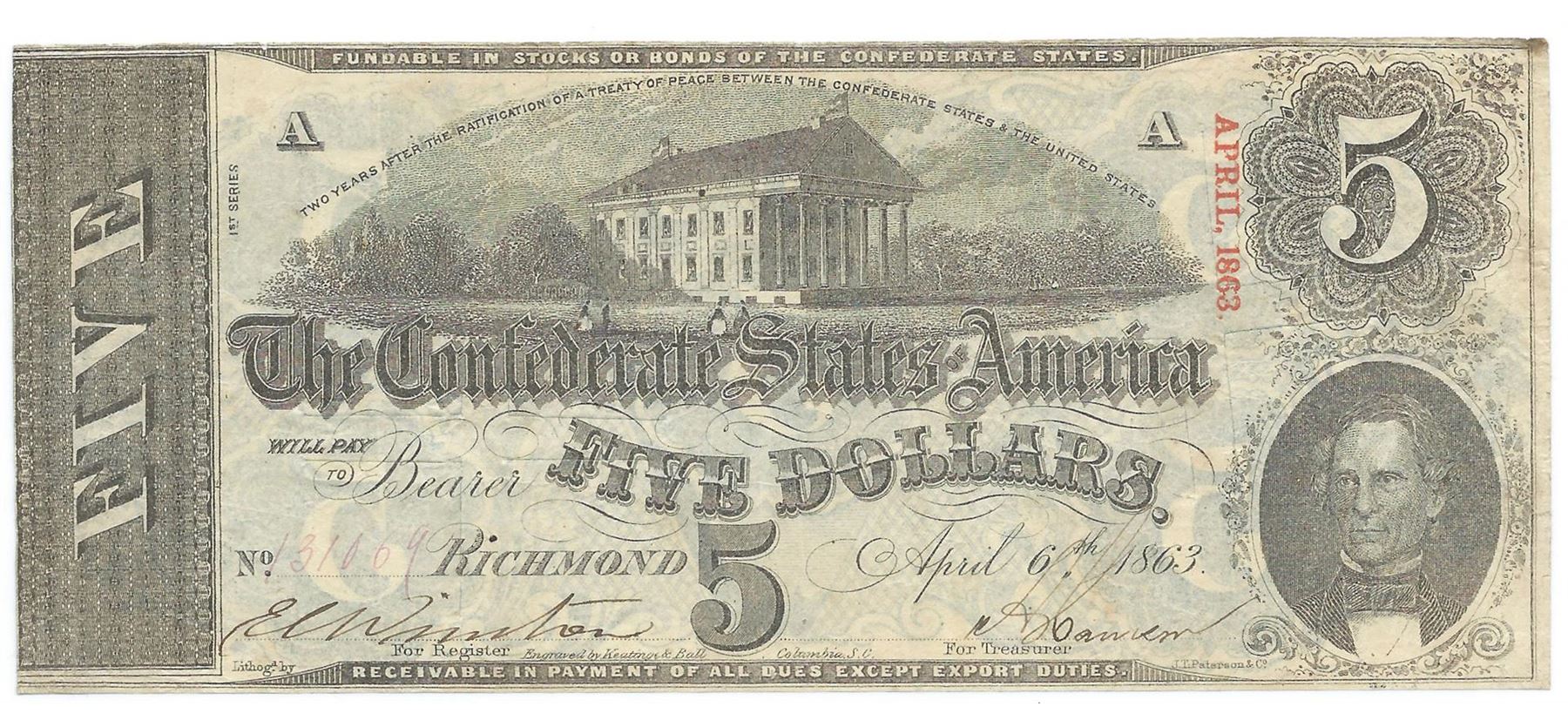 One 1863 $5 The Confederate States of America Note T-60 CC