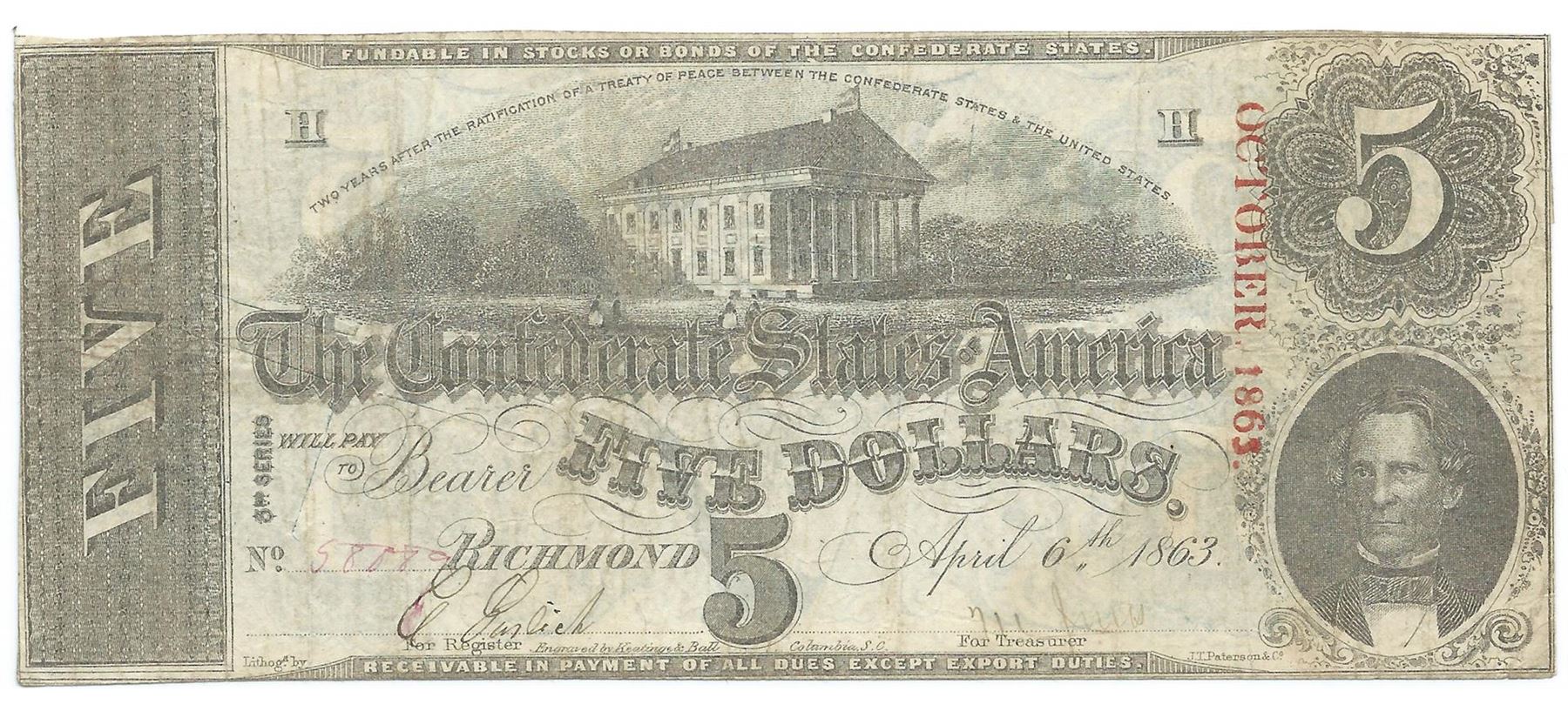One 1863 $5 The Confederate States of America Note T-60 CC