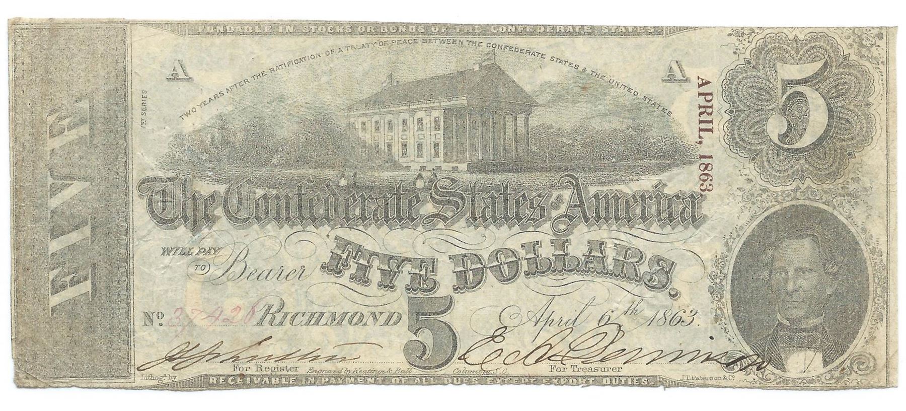 One 1863 $5 The Confederate States of America Note T-60 CC