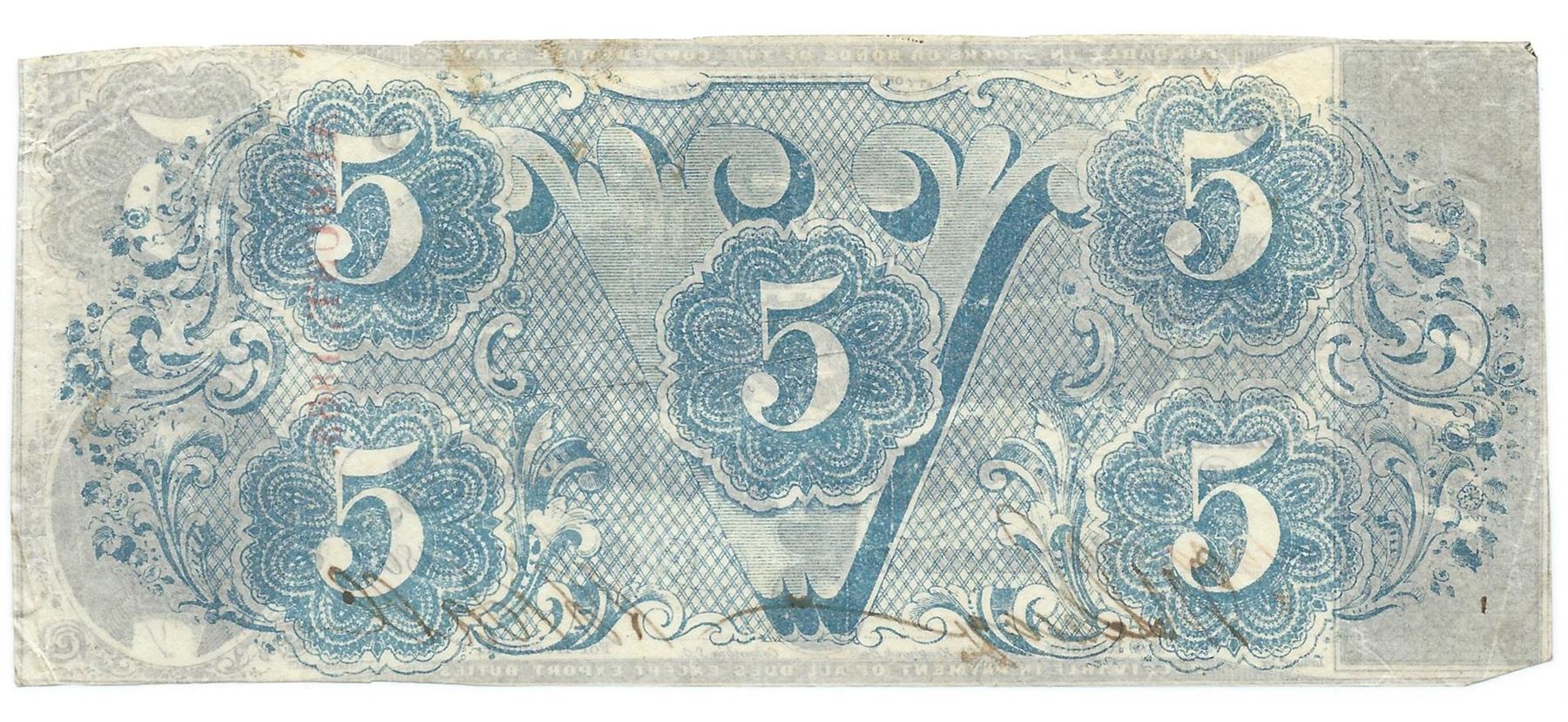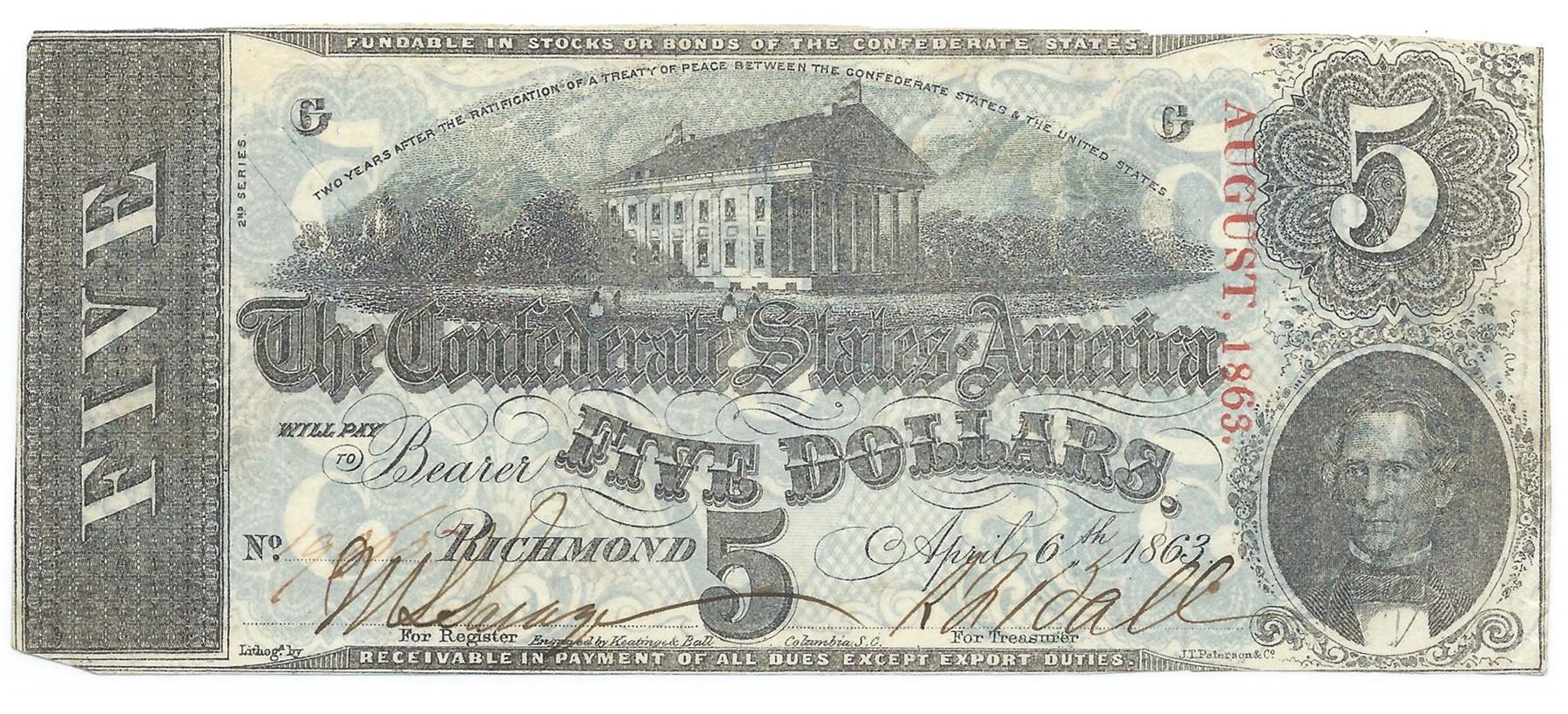 One 1863 $5 The Confederate States of America Note T-60 CC