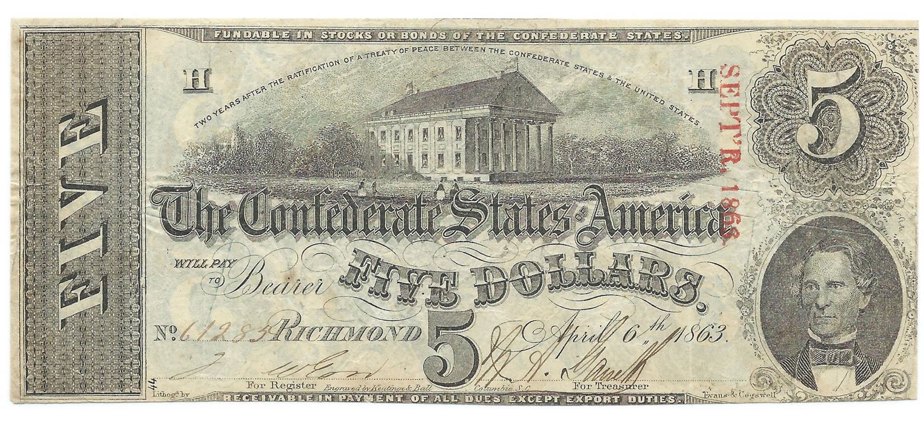 One 1863 $5 The Confederate States of America Note T-60 CC