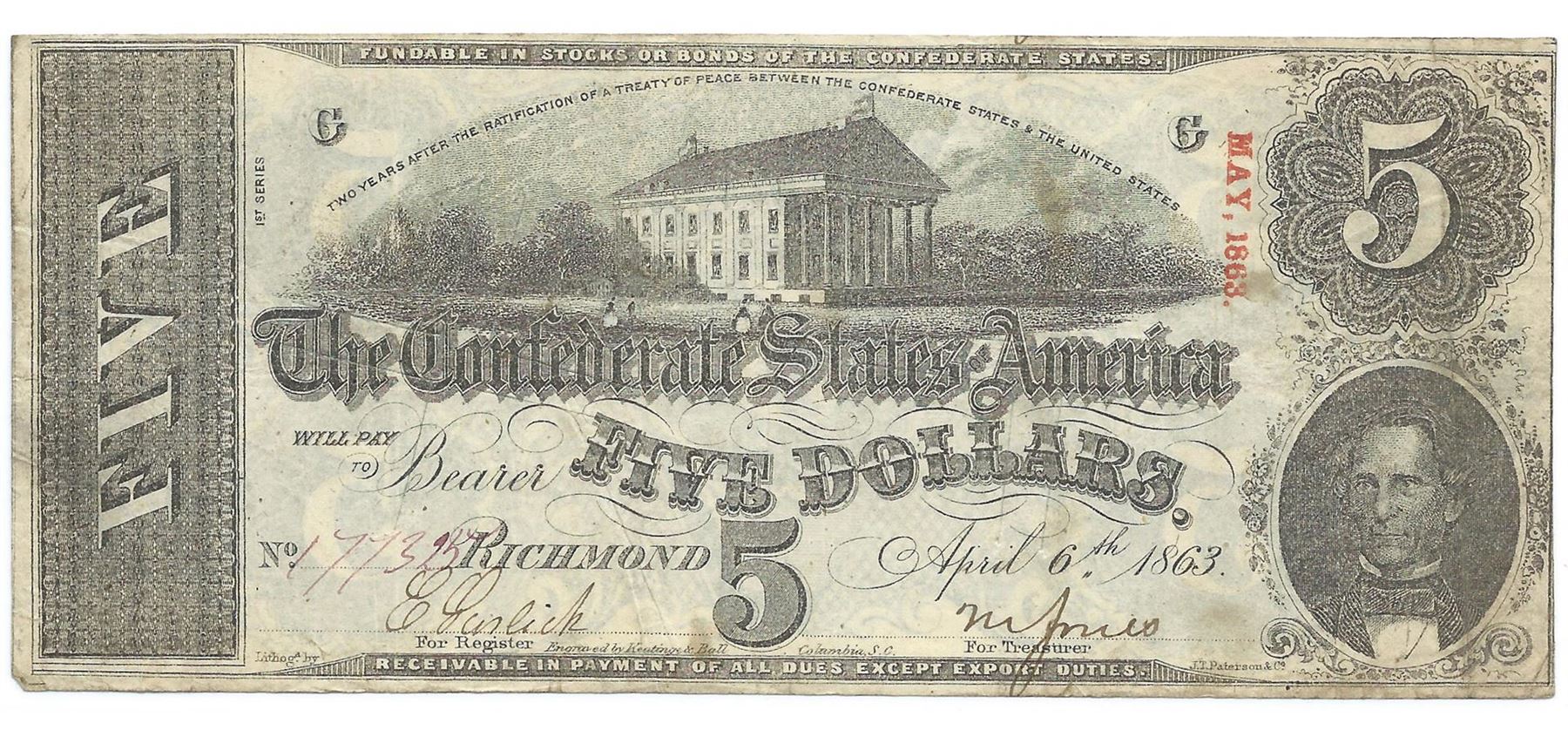 One 1863 $5 The Confederate States of America Note T-60 CC