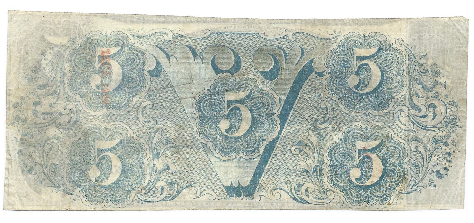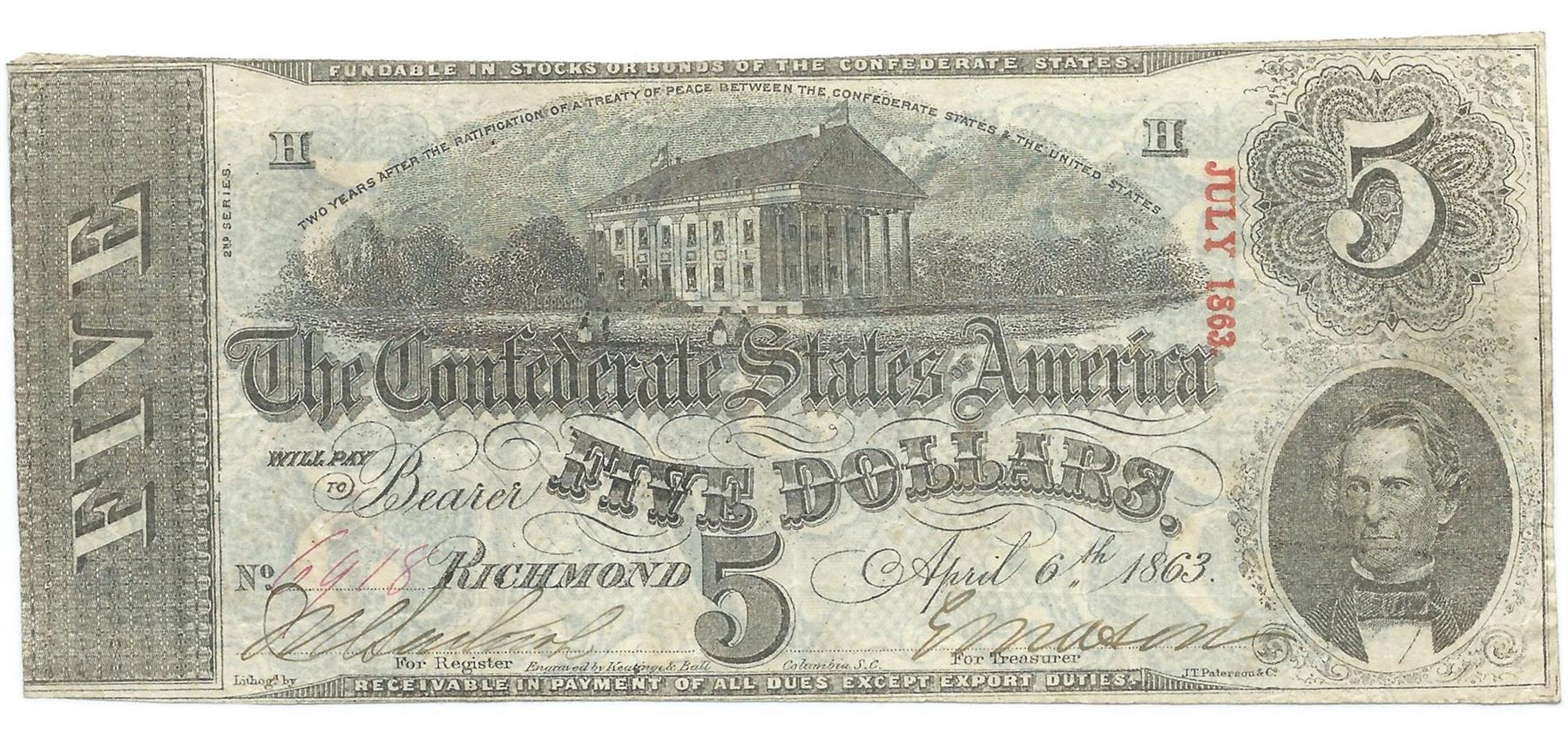 One 1863 $5 The Confederate States of America Note T-60 CC