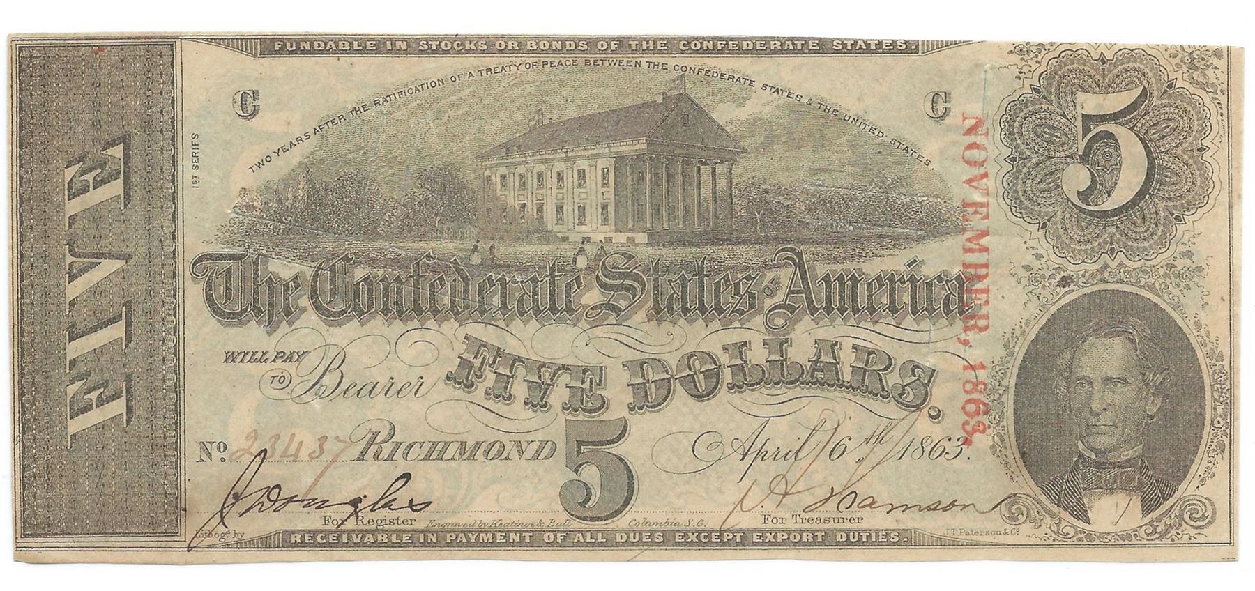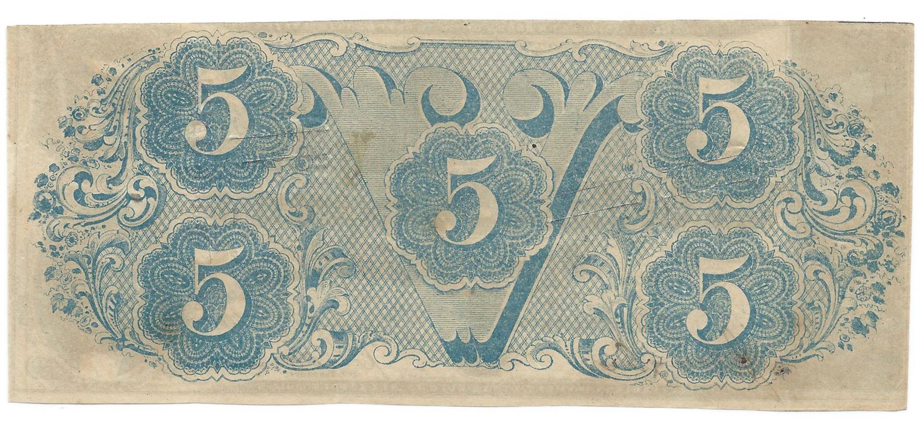 One 1863 $5 The Confederate States of America Note T-60 CC
