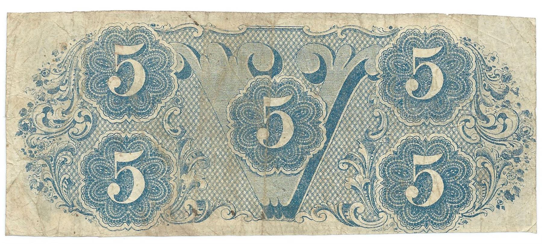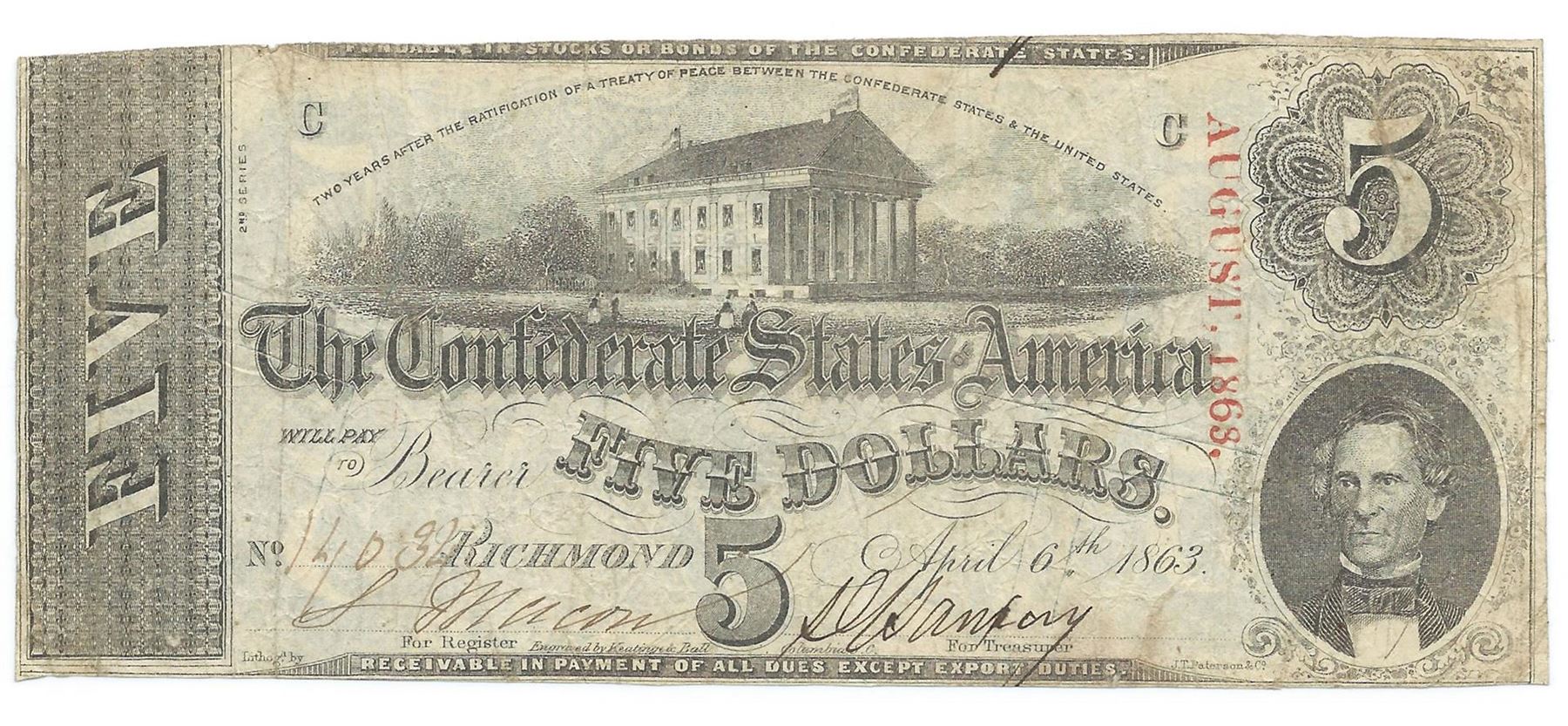 One 1863 $5 The Confederate States of America Note T-60 CC
