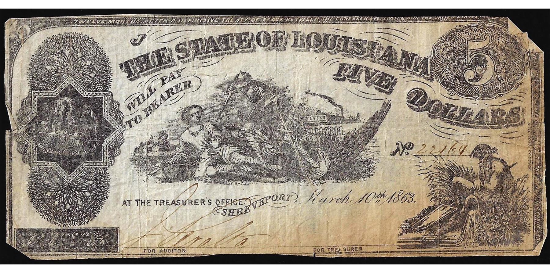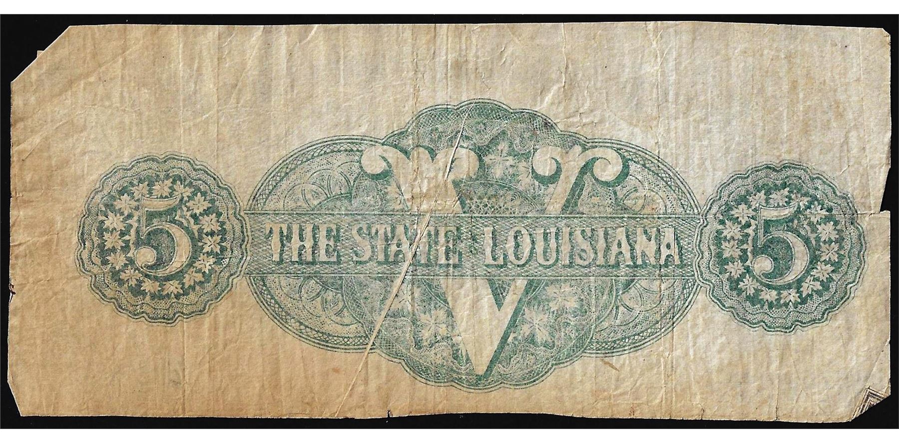 One 1863 $5 The State of Louisiana Baton Rouge, LA Obsolete Banknote.