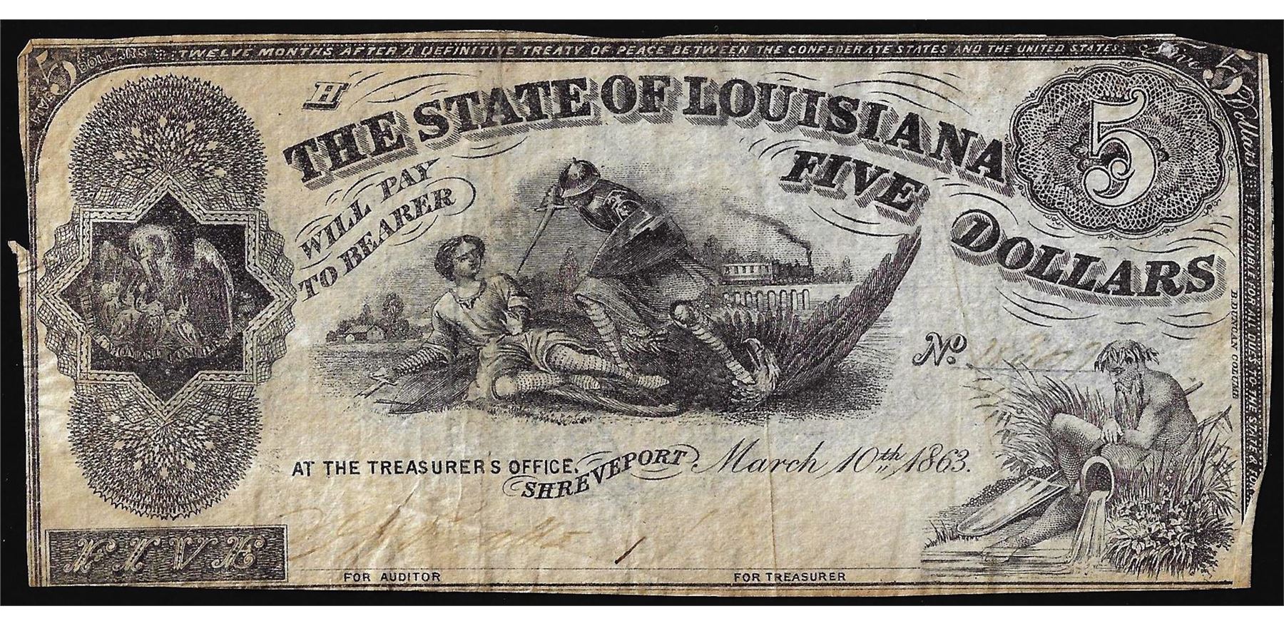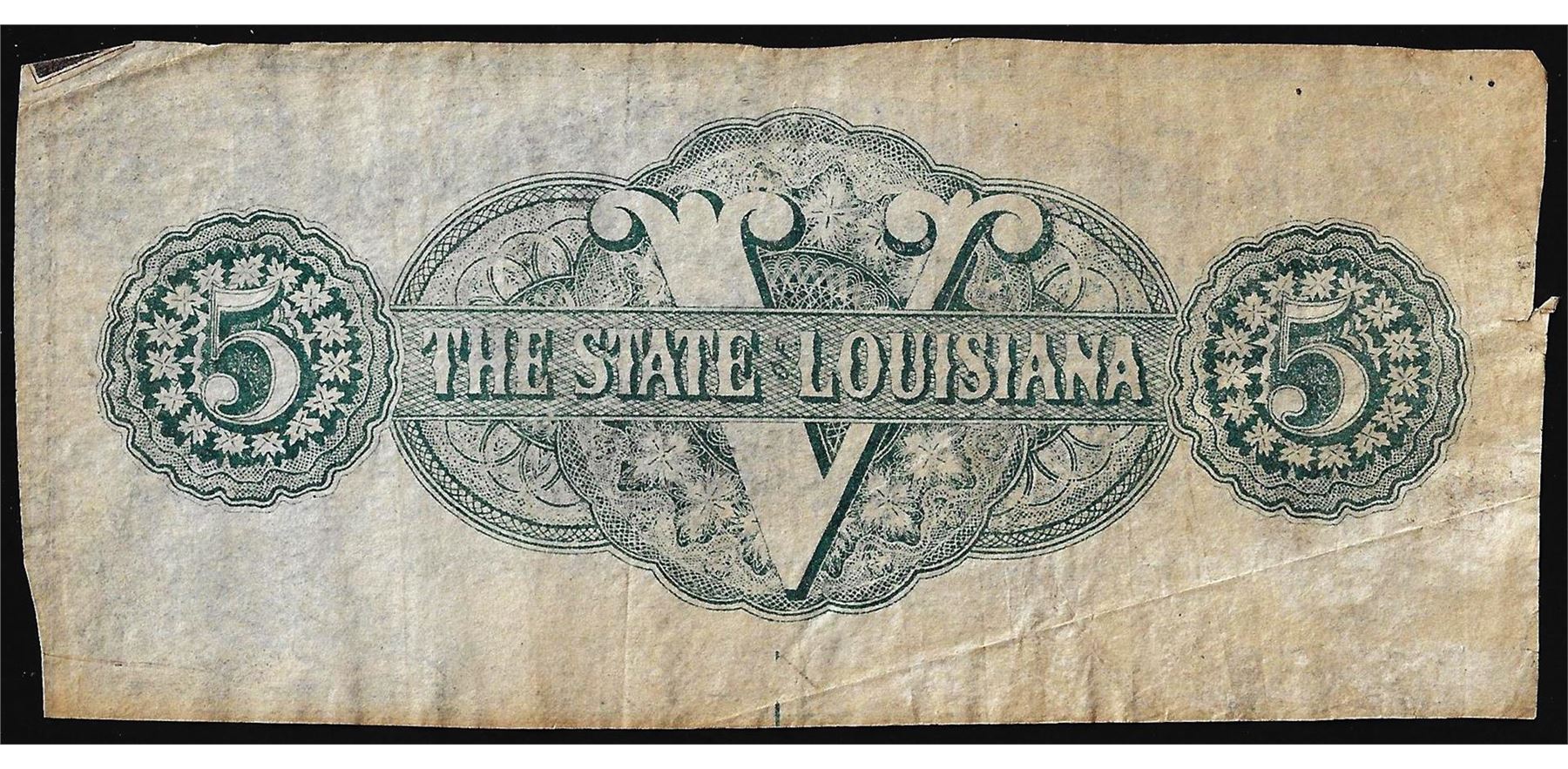 One 1863 $5 The State of Louisiana Baton Rouge, LA Obsolete Banknote.