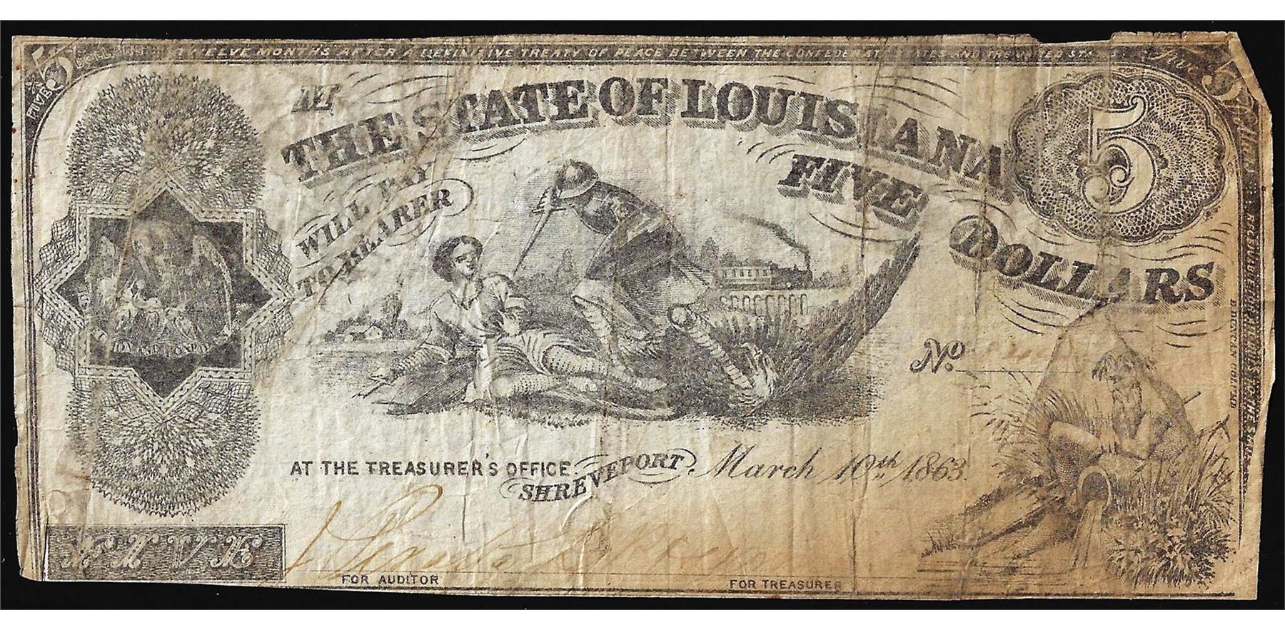 One 1863 $5 The State of Louisiana Baton Rouge, LA Obsolete Banknote.