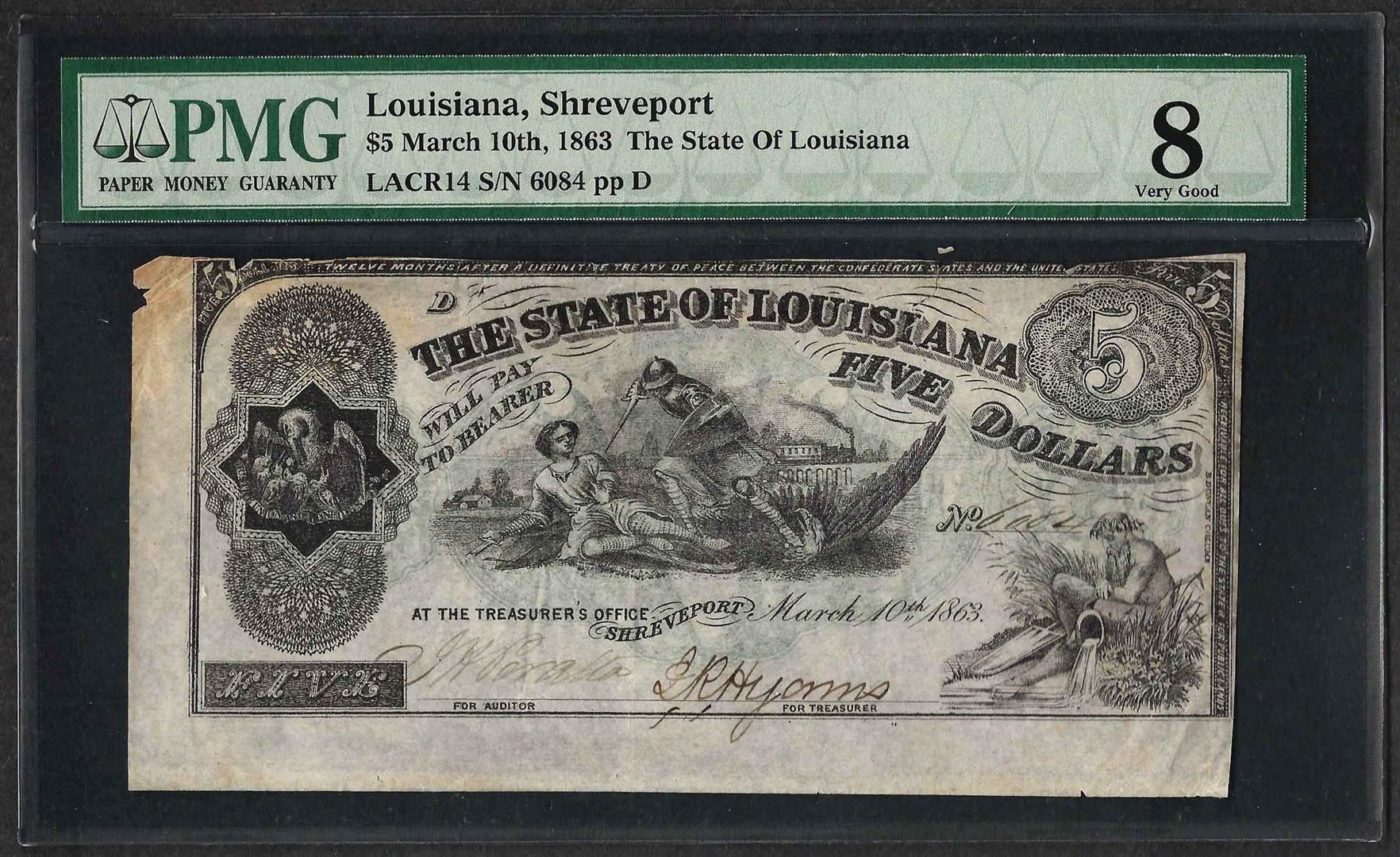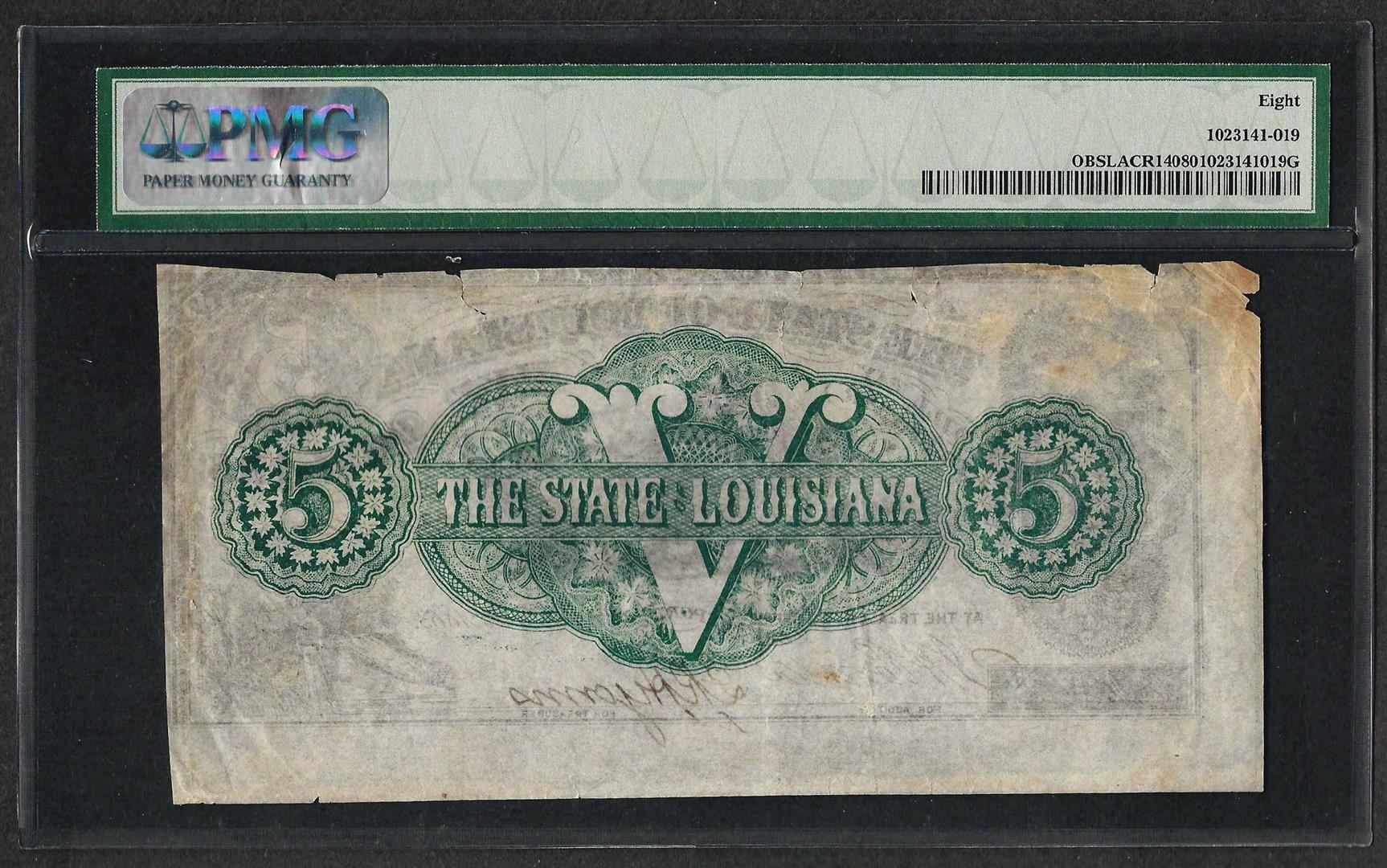 One 1863 $5 The State of Louisiana Obsolete Note PMG Very Good 8. PMG Certified.