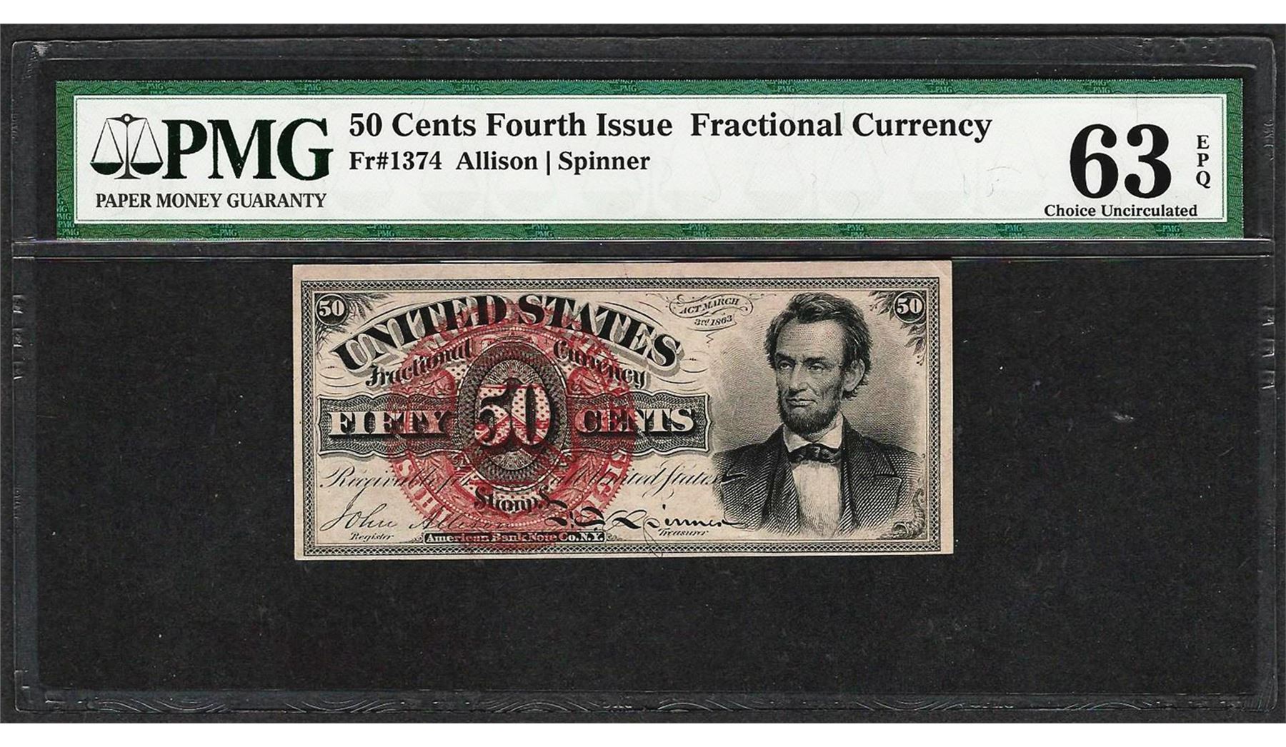 One 1863 50 Cent Fourth Issue Lincoln Fractional Currency Note PMG Choice Unc. 63EPQ. PMG Certified.