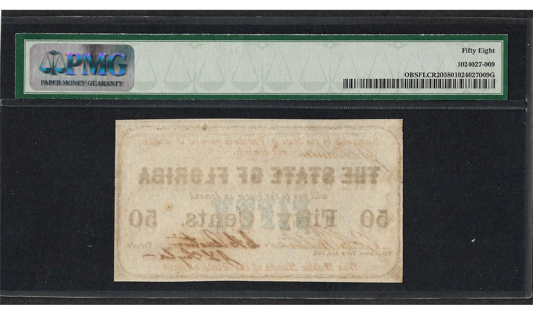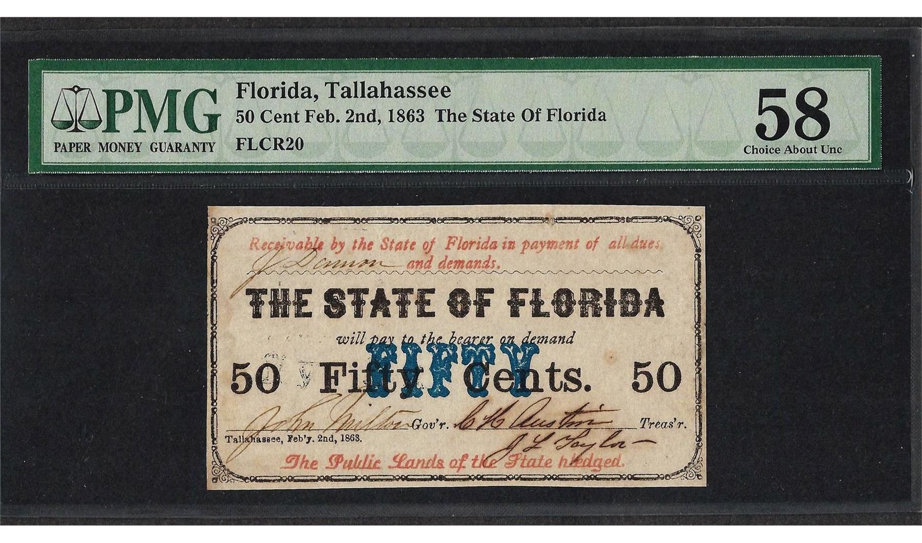 One 1863 50 Cent The State of Florida Obsolete Note PMG Choice About Uncirculated 58. PMG Certified.