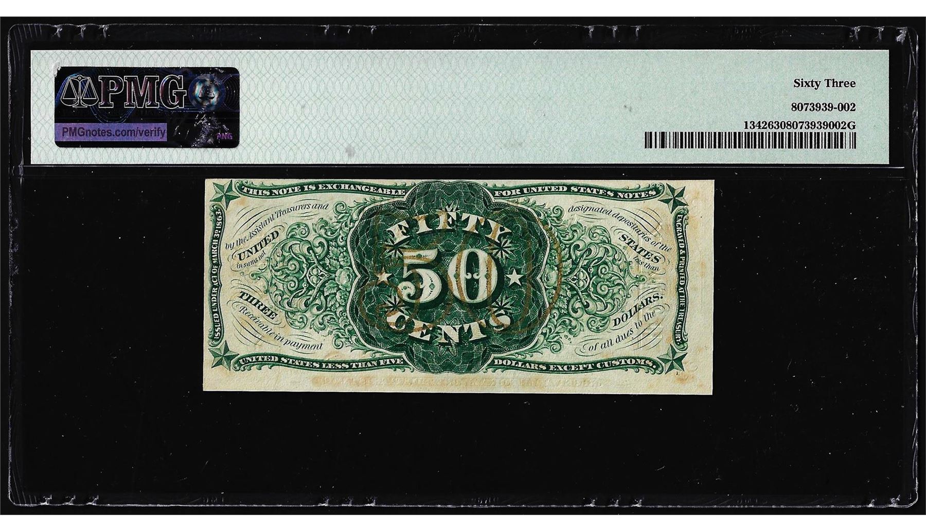 One 1863 50 Cents Third Issue Fractional Currency Note Fr.1342 PMG Choice Uncirculated 63. PMG Certified.