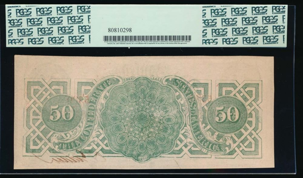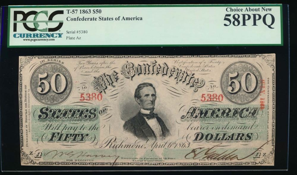 One 1863 $50 Confederate States of America Note PCGS 58PPQ.