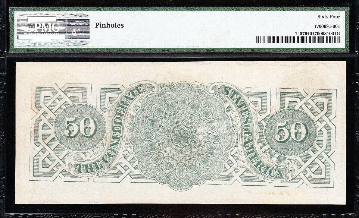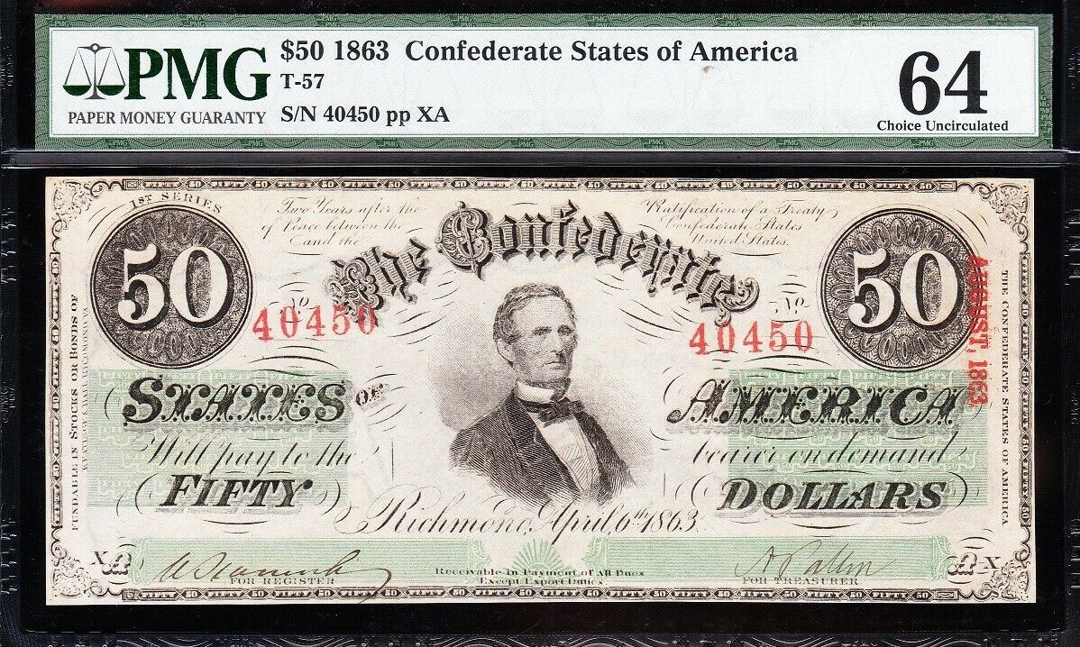 One 1863 $50 T-57 Confederate PMG 64.