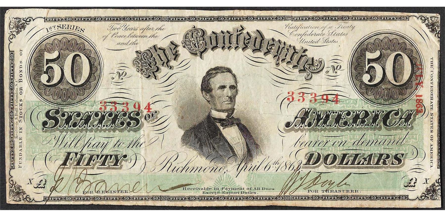 One 1863 $50 The Confederate States of America Note Cut Canceled.