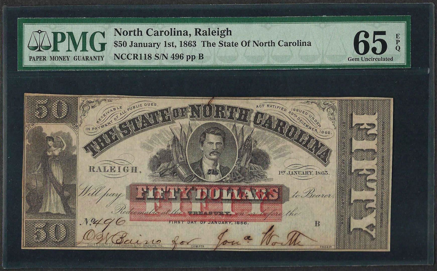 1863 $50 The State of North Carolina Obsolete Note PMG Gem Uncirculated 65EPQ